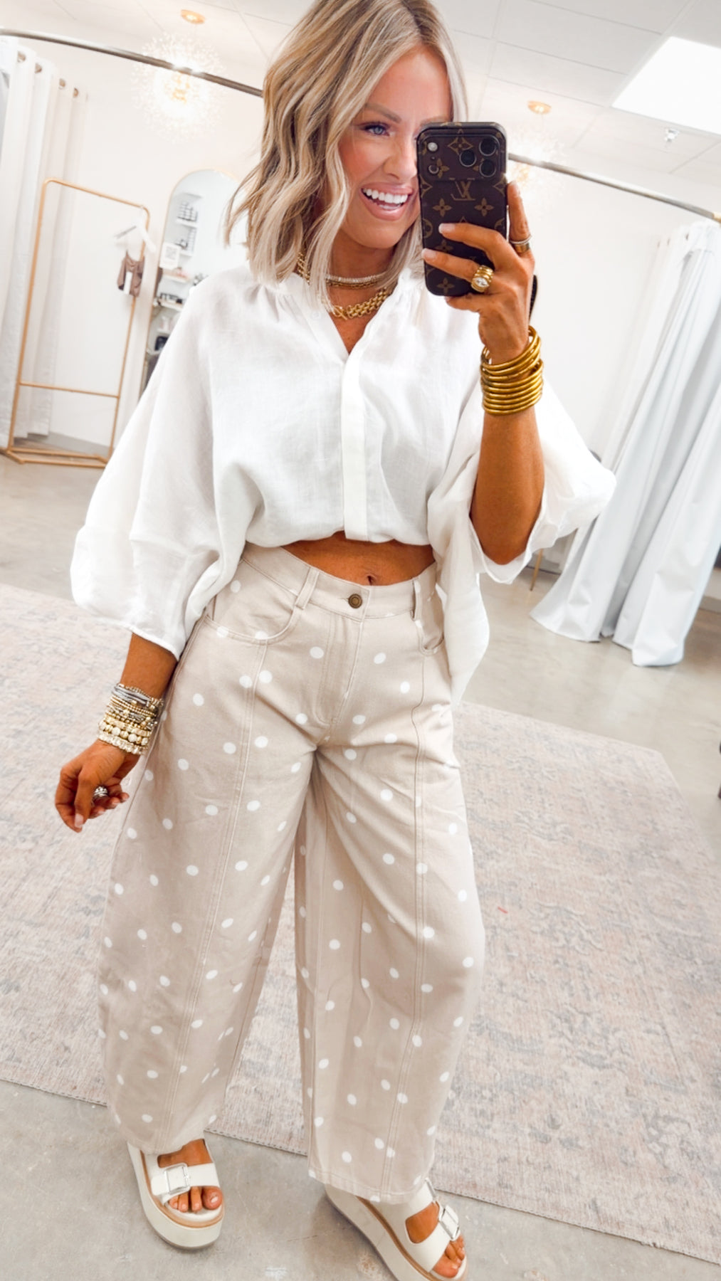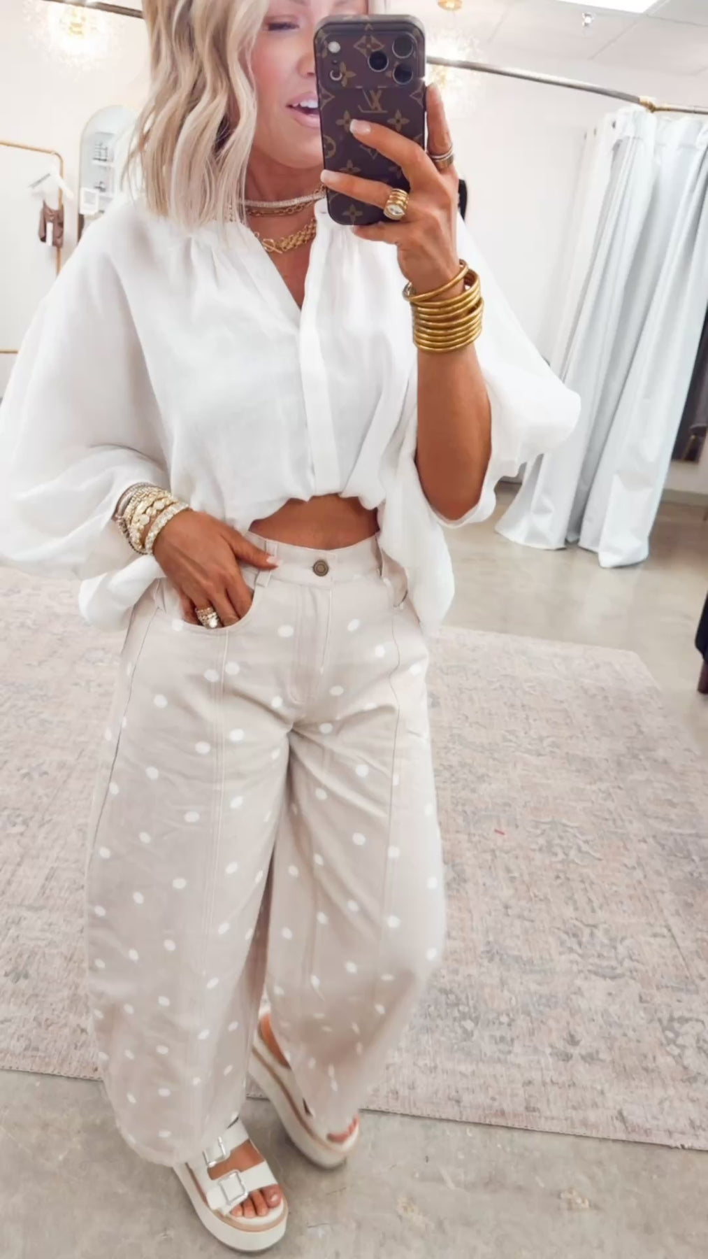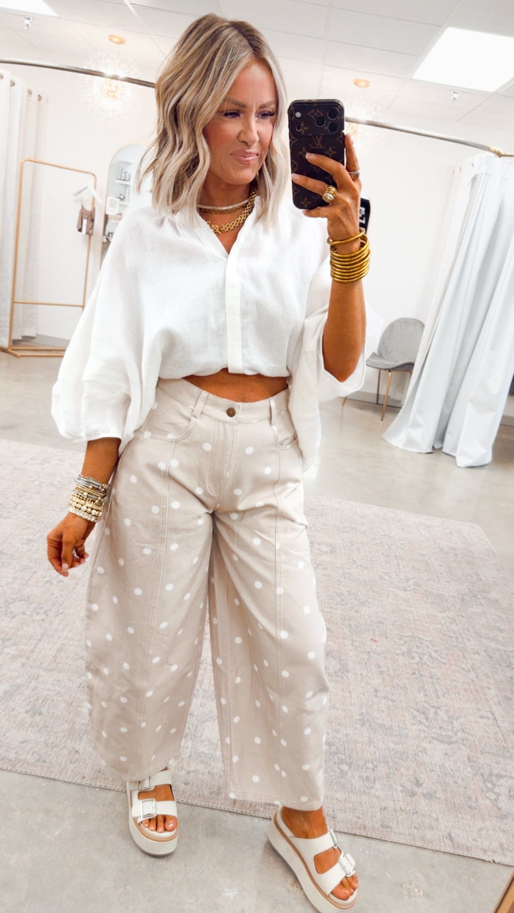 Effortlessly playful with a fashion-forward twist, the Dottie Darling Barrel Jeans are made to stand out. Designed in a wide-leg barrel silhouette, these statement denims feature a charming polka dot print that brings a whimsical, feminine touch to a modern, structured shape. The result is a perfect balance of fun and chic — bold without feeling overdone.