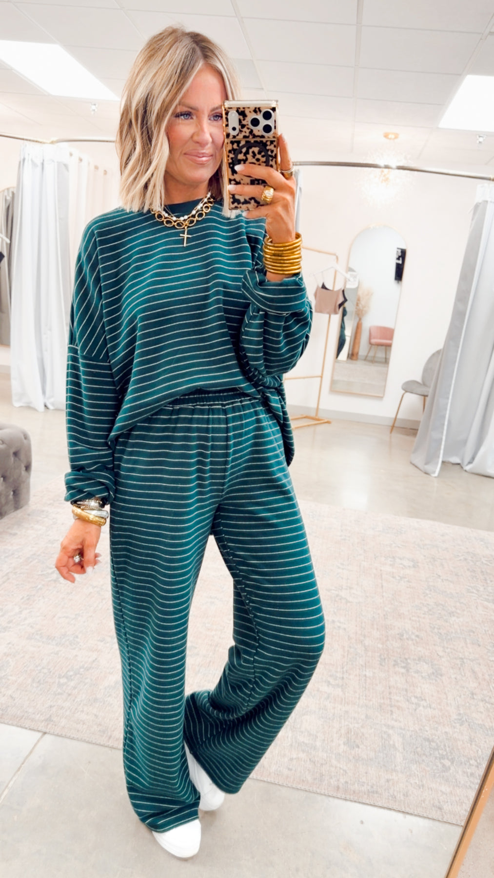 The Lexi Striped Lounge Pants are your new go-to for cozy days when comfort meets cute, effortless style. Made from a soft, fleece-like fabric, these pants feel ultra-comfy against the skin while still looking polished enough for everyday wear. Designed with a flattering high-rise fit and an elastic waistband, they offer easy pull-on styling and all-day comfort. Finished in a fresh green and white stripe, these lounge pants are perfect for laid-back days at home or casual outings where you still want to look put together.