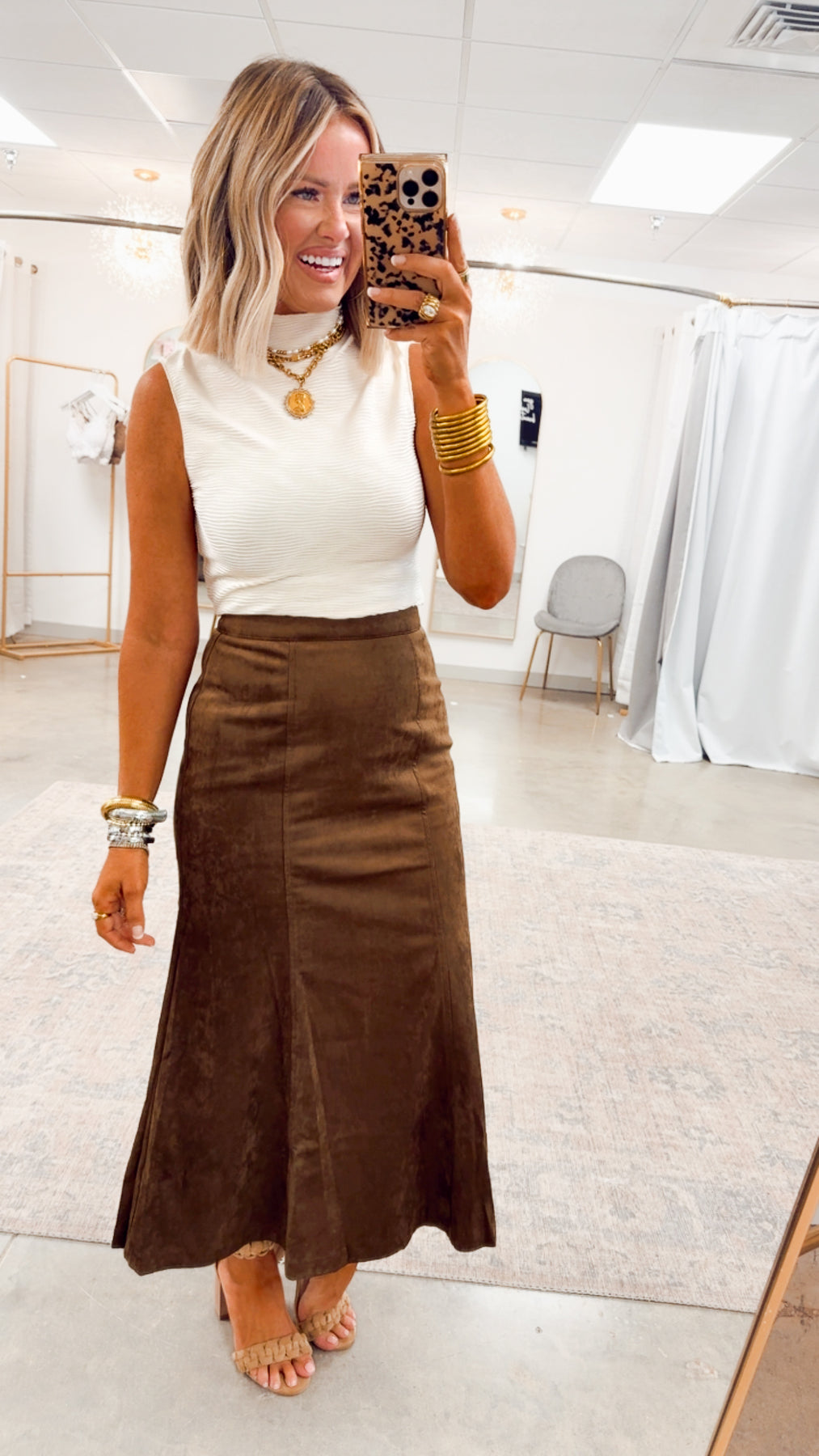 The Maple Street Suede Skirt is the ultimate fall staple—effortlessly chic, versatile, and oh-so-easy to style. With its timeless midi length and soft suede texture, this skirt transitions seamlessly from casual days to dressed-up nights. Pair it with your coziest sweater and booties for a seasonal look, or style it with a graphic tee and sneakers for laid-back charm.