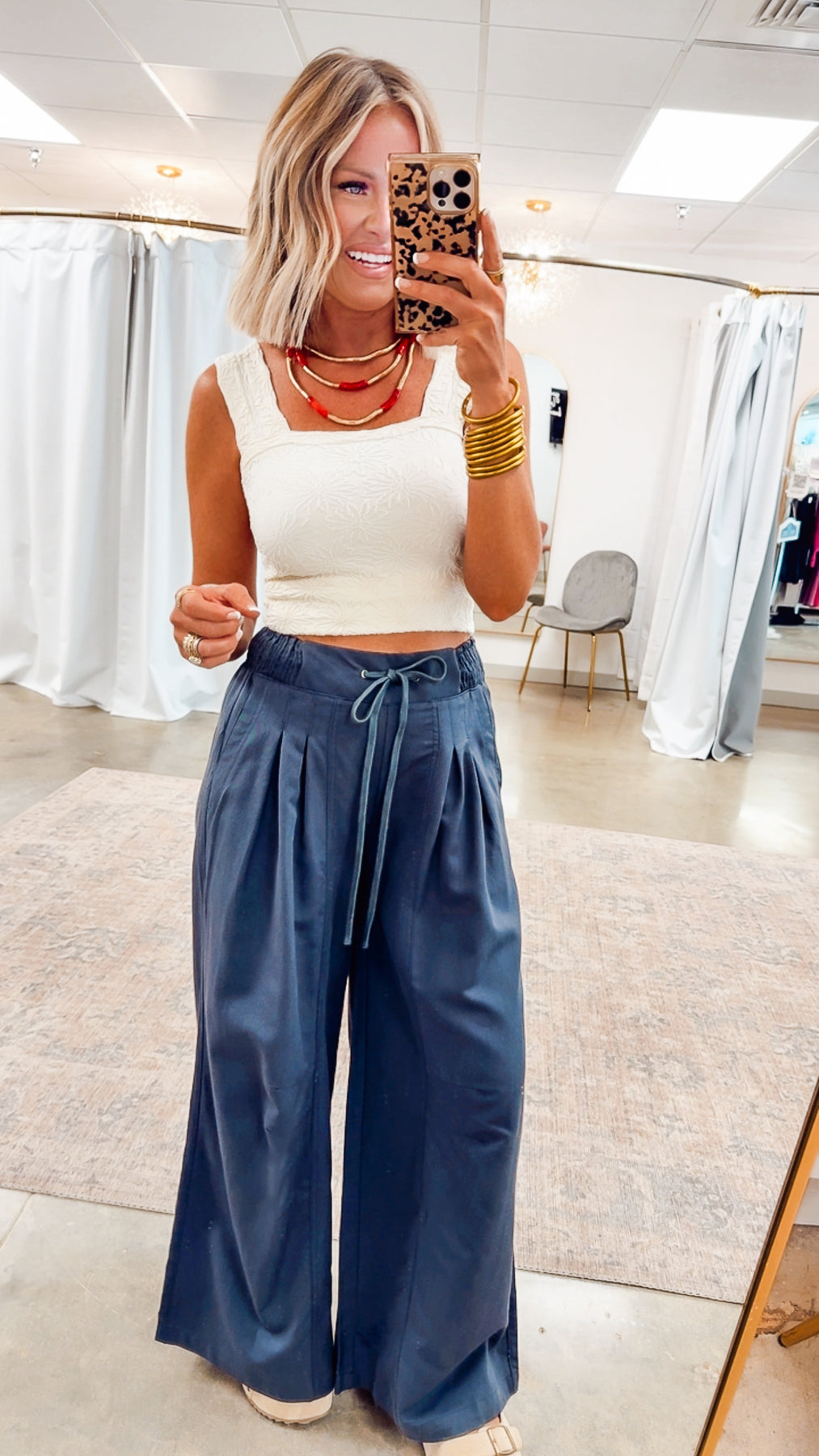 Stay effortlessly chic in The Haven Pleated Pants, your new go-to wide-leg bottoms for comfort and style. Designed with a breezy pleated silhouette, these pants feature a smocked waistband with an adjustable drawstring for the perfect fit. The flowy wide legs create an easy, flattering drape—perfect for everyday wear yet polished enough to dress up for brunch, work, or dinner out. A back patch pocket adds a subtle touch of utility while keeping the style relaxed and versatile.
