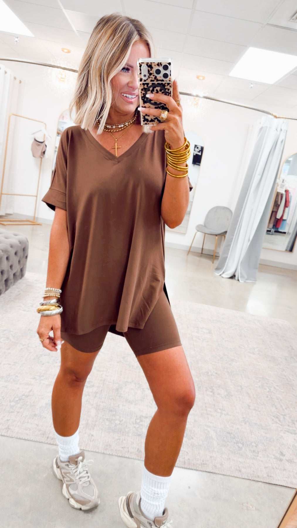 Upgrade your lounge-and-go wardrobe with the Soft Sculpt Biker Shorts Set, crafted from luxuriously brushed DTY microfiber that feels buttery soft against the skin. This matching set features a flattering V-neck hi-low hem top paired with perfectly stretchy biker shorts for a comfy, sculpted fit that moves with you. Whether you're running errands, relaxing at home, or heading out for a casual day, this set delivers the ideal blend of comfort, style, and versatility.