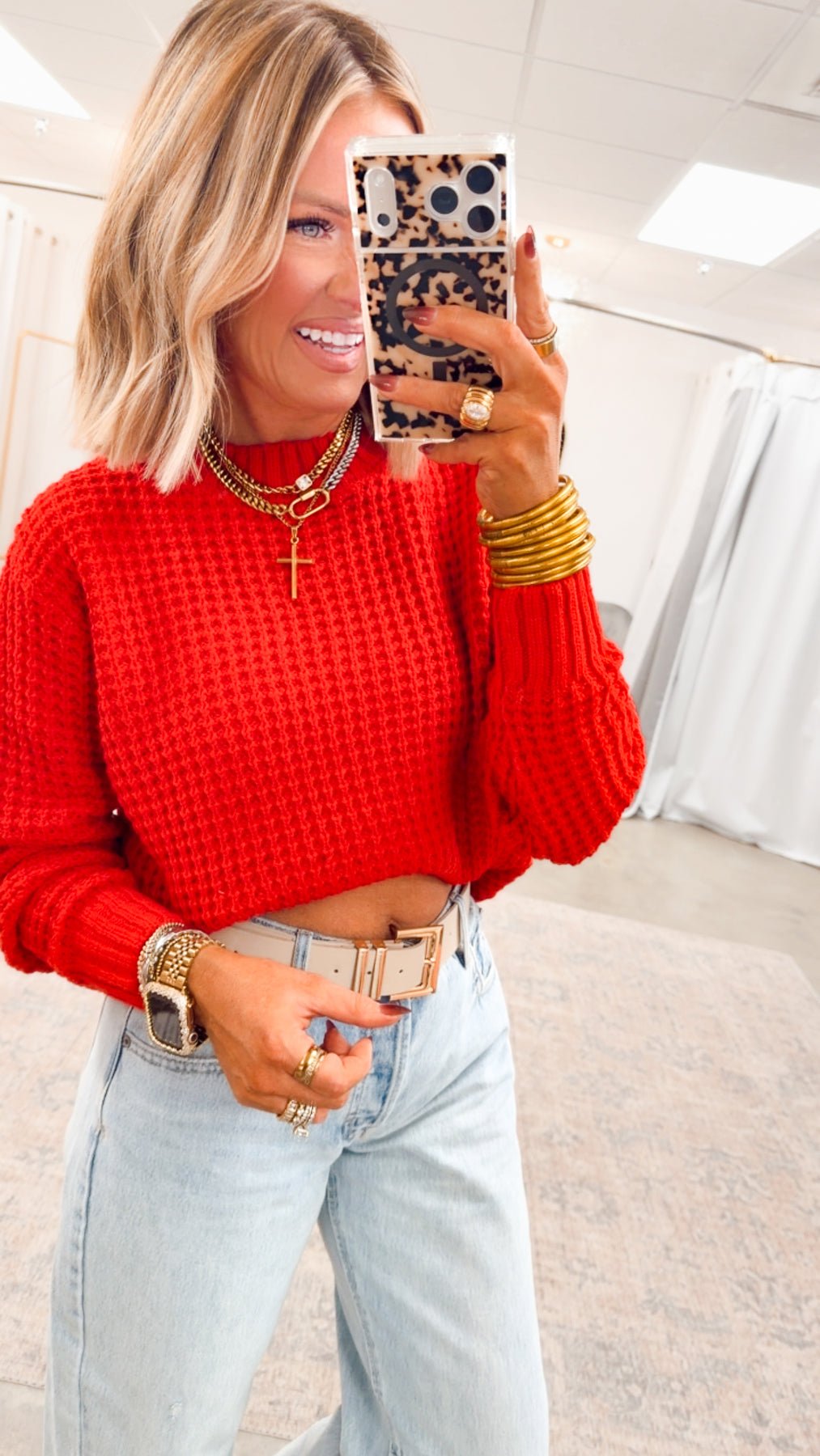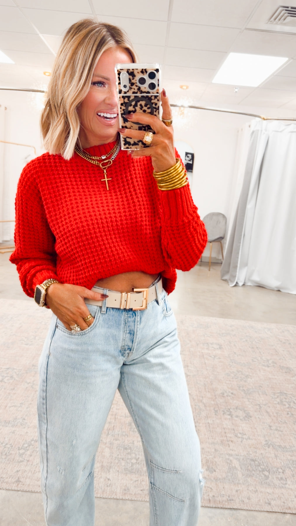 Cozy, textured, and effortless — this hi-low waffle sweater is the perfect throw-on piece for everyday comfort. Designed with a relaxed silhouette, curved hem, and soft waffle knit texture, it offers an easy, flattering drape that pairs beautifully with denim, leggings, or lounge bottoms. A timeless essential for layering season after season.