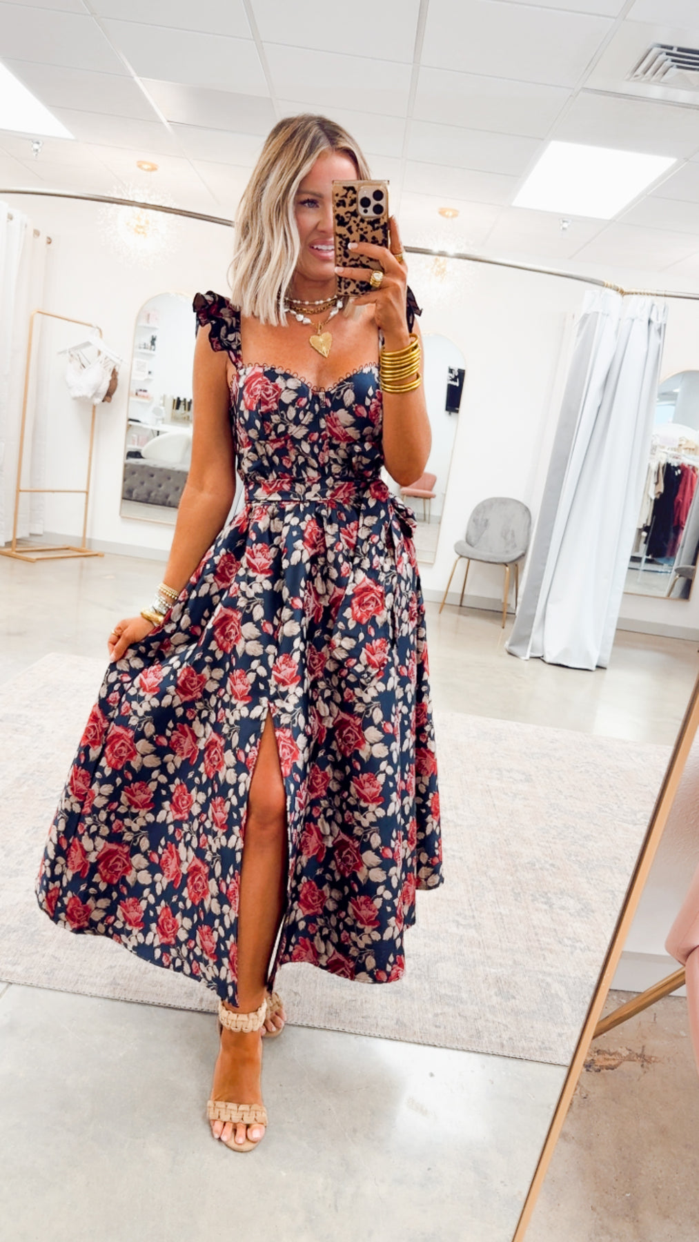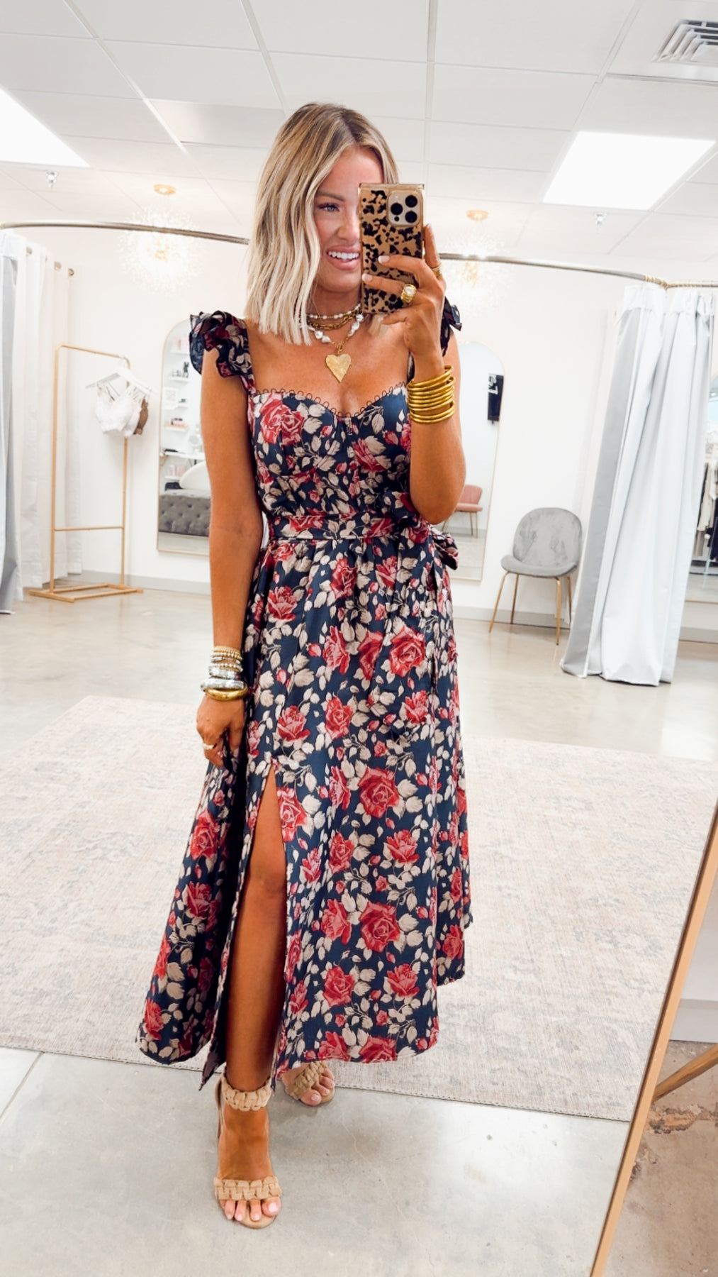 Romantic and timeless, the Elowen Rose Dress is the ultimate fall statement piece. Crafted in a rich jacquard fabric with a delicate floral pattern, this dress captures all the elegance you want for the season. The ruffled cap sleeves add a feminine touch, while the warm fall palette makes it a perfect choice for weddings, parties, and any special occasion.
