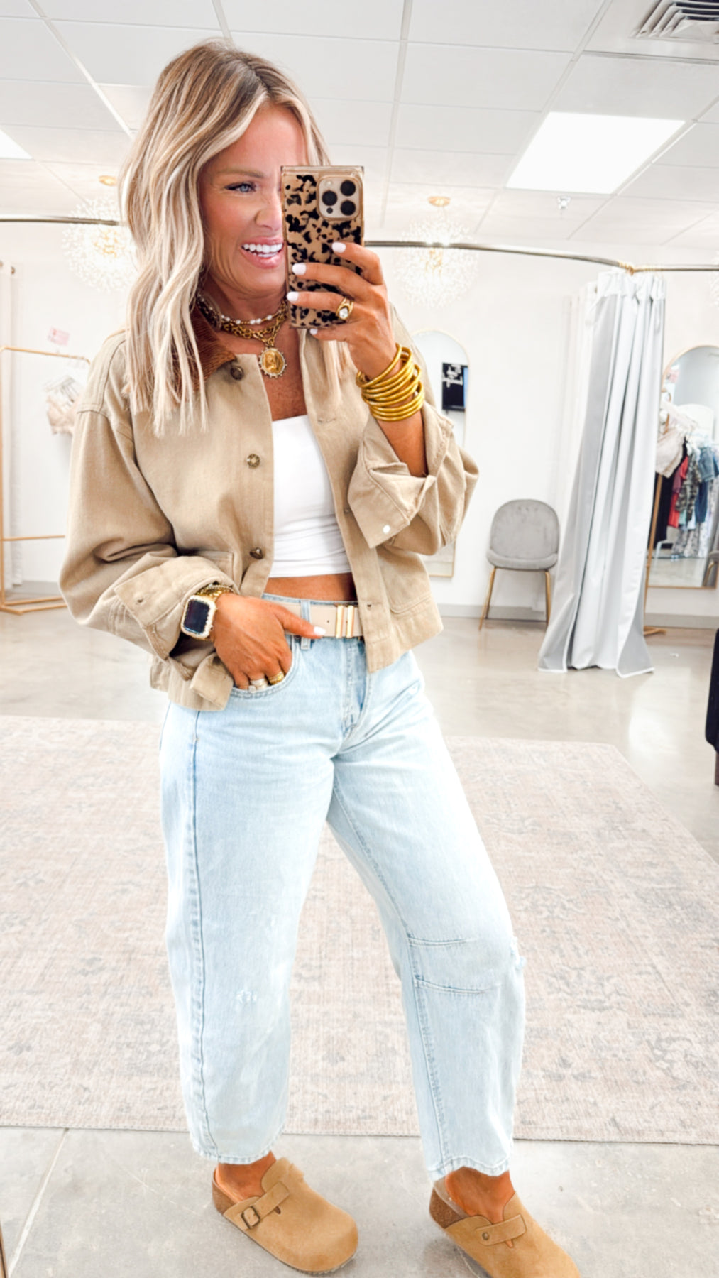 Western-inspired with a modern twist, the Dakota Cropped Barn Jacket is the must-have layering piece for fall. Crafted from durable cotton twill with a soft corduroy collar, this jacket pairs rustic charm with everyday wearability. Its cropped cut gives it a fashion-forward edge, while the classic barn-jacket details — from the functional buttons to the roomy front pockets — keep it timeless and practical. Perfect for tossing over sweaters, tees, or dresses, this cutie will be your go-to all season long.