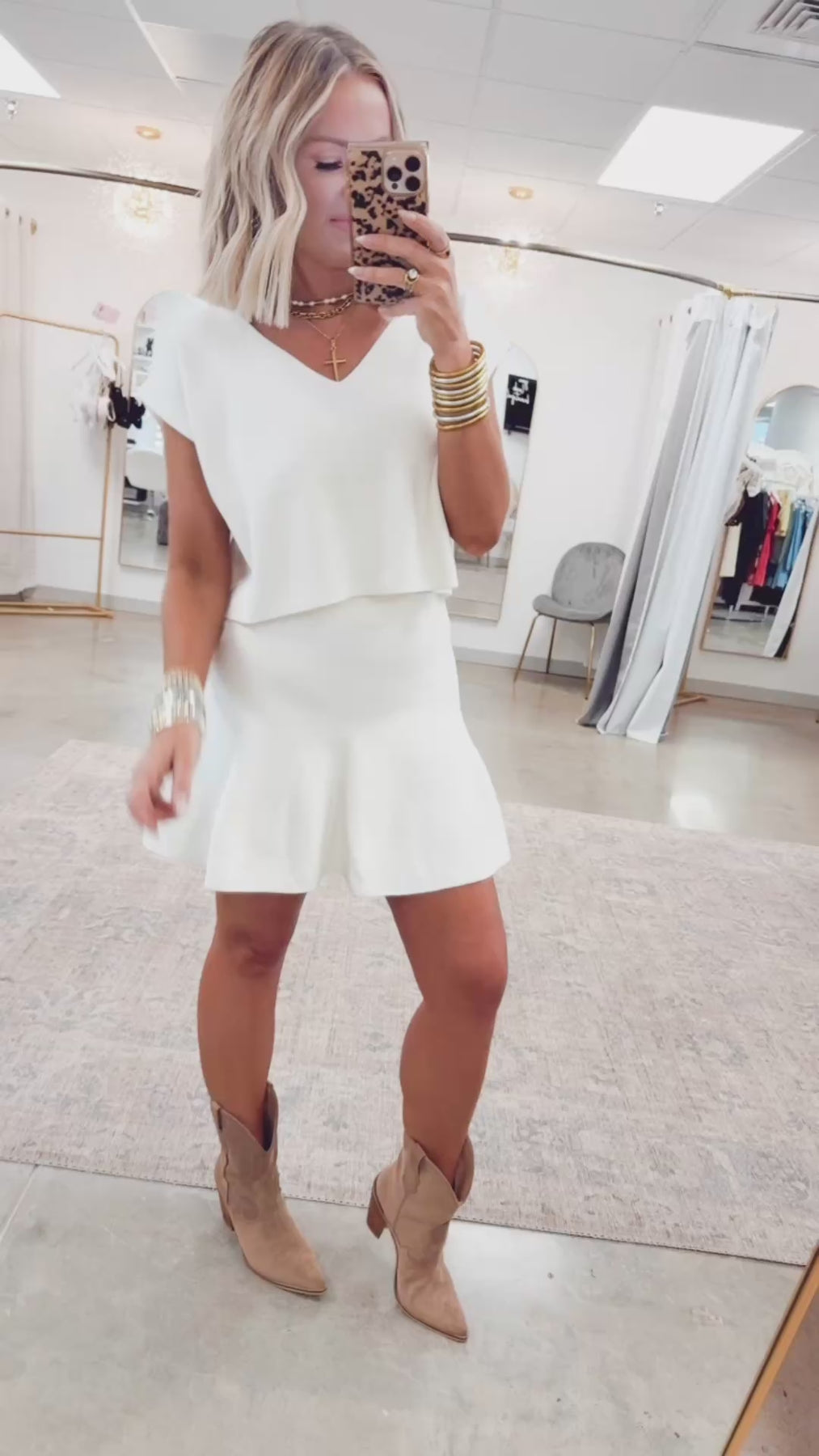 The Afterglow Sweater & Skirt Set is your new go-to for all the upcoming events and parties this season. With its chic silhouette and effortless pull-on style, this set perfectly blends cozy comfort with a touch of playful charm.