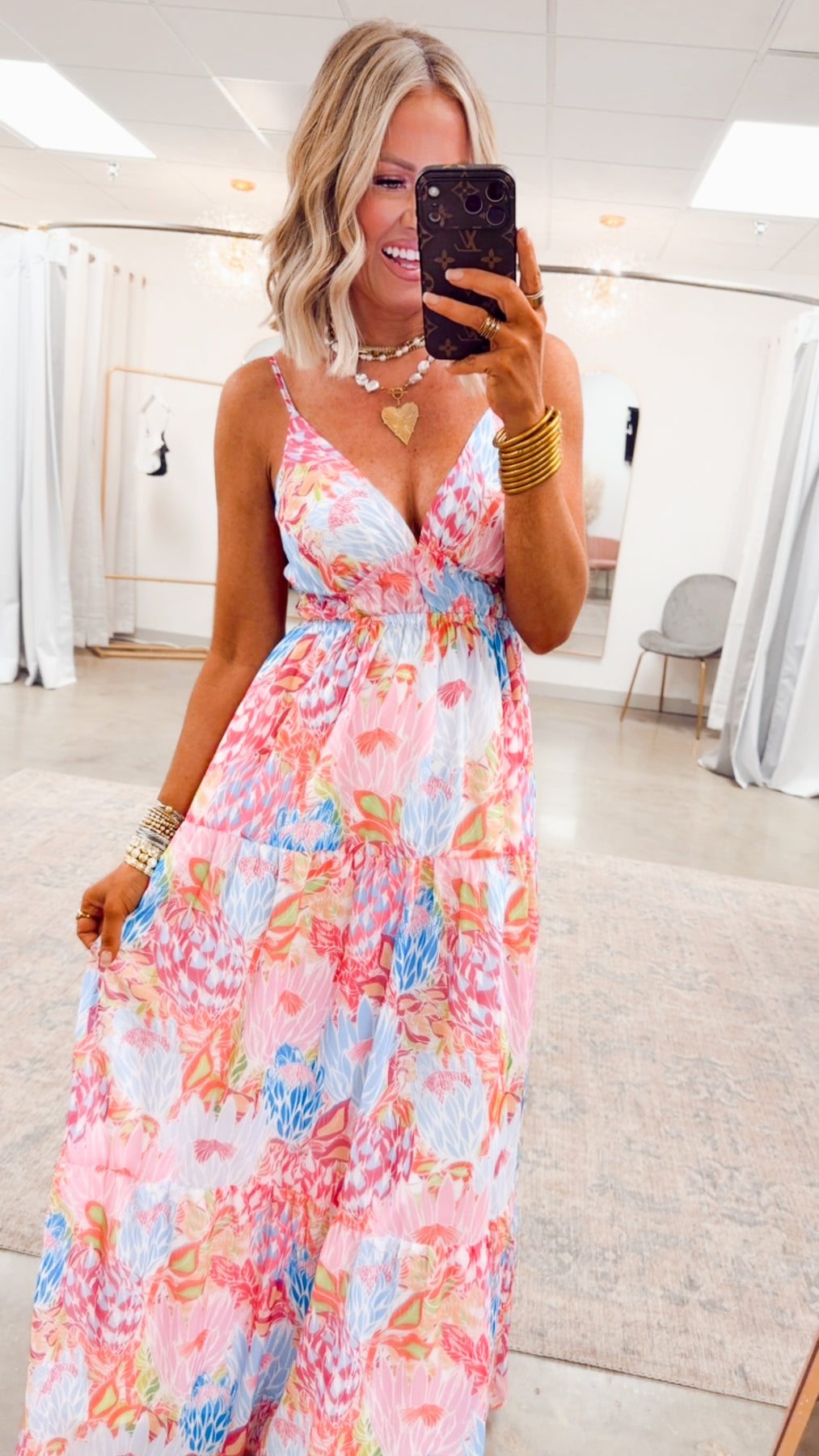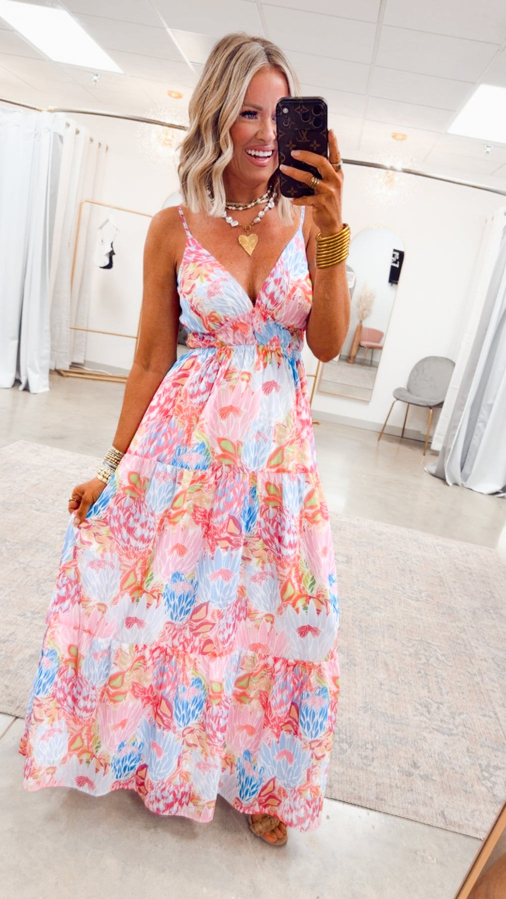 The whimsical, painterly floral print features soft rose, sunset orange, and azure blue tones that feel fresh, dreamy, and effortlessly summer-ready. A flattering deep V-neckline and delicate adjustable spaghetti straps create a beautifully feminine silhouette, while the tiered skirt cascades gracefully for fluid, romantic movement. Finished with a comfortable smocked back for a custom-feel fit, this dress blends beauty with wear-all-day comfort.