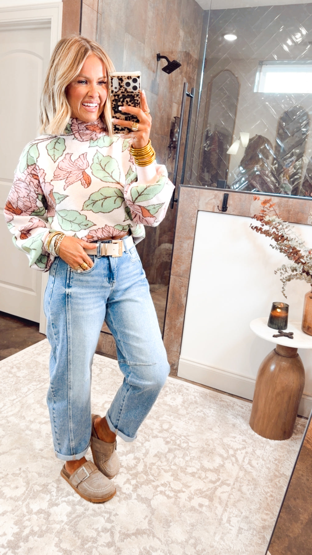 Whether styled with denim for everyday wear or dressed up with trousers and boots, this floral mock neck sweater is a cold-weather favorite you’ll reach for again and again.