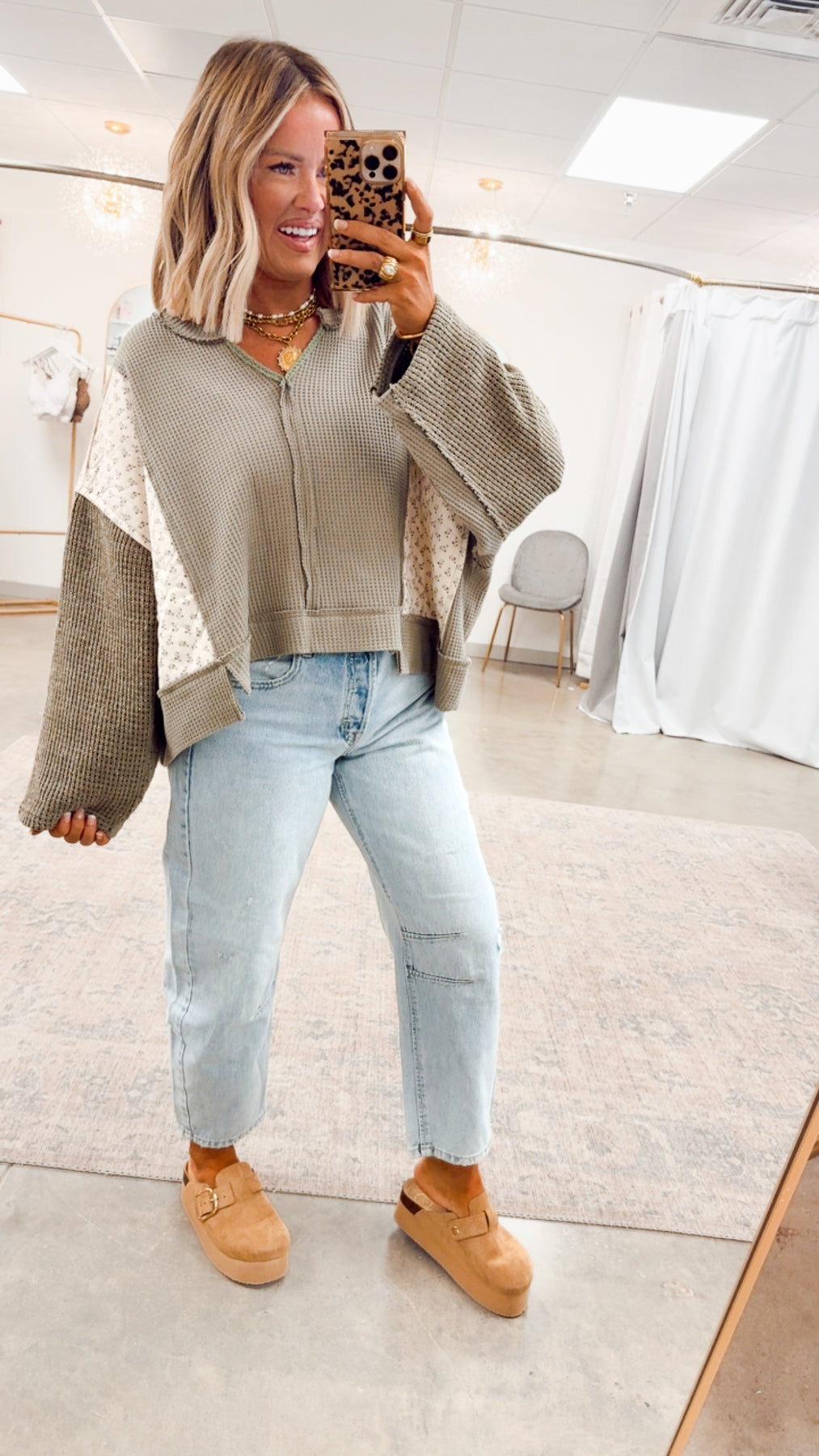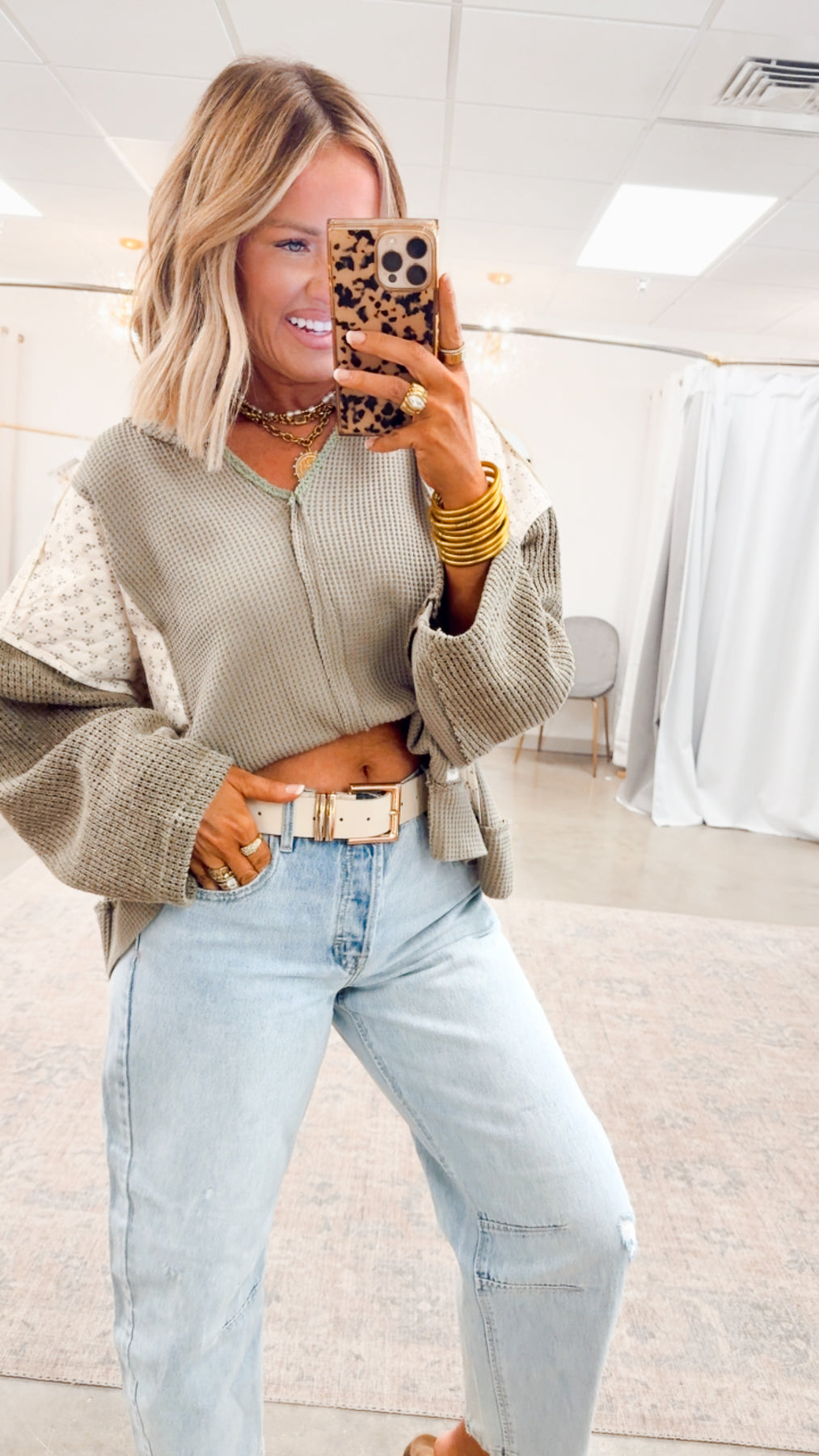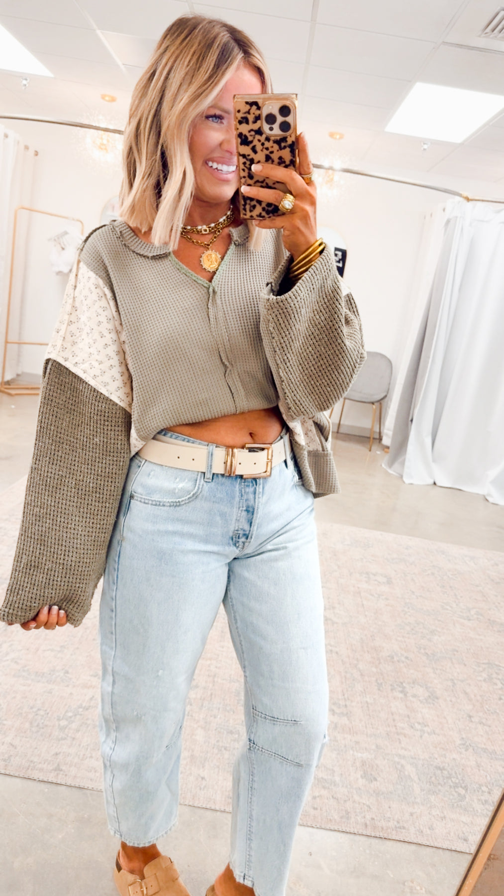 Earthy tones meet laid-back elegance in the Moonlit Moss Top. Designed with a flattering V-neckline and straight sleeves, this cropped silhouette blends cozy thermal texture with quilted knit accents. Raw edge details and a subtle floral pattern add a touch of effortless charm, making it the perfect top for relaxed days that still call for style.