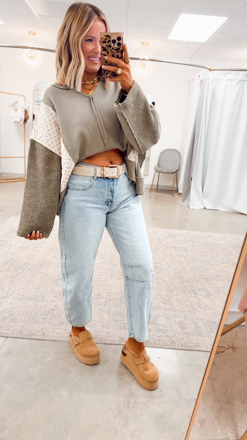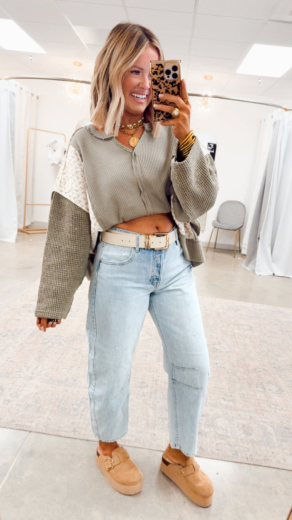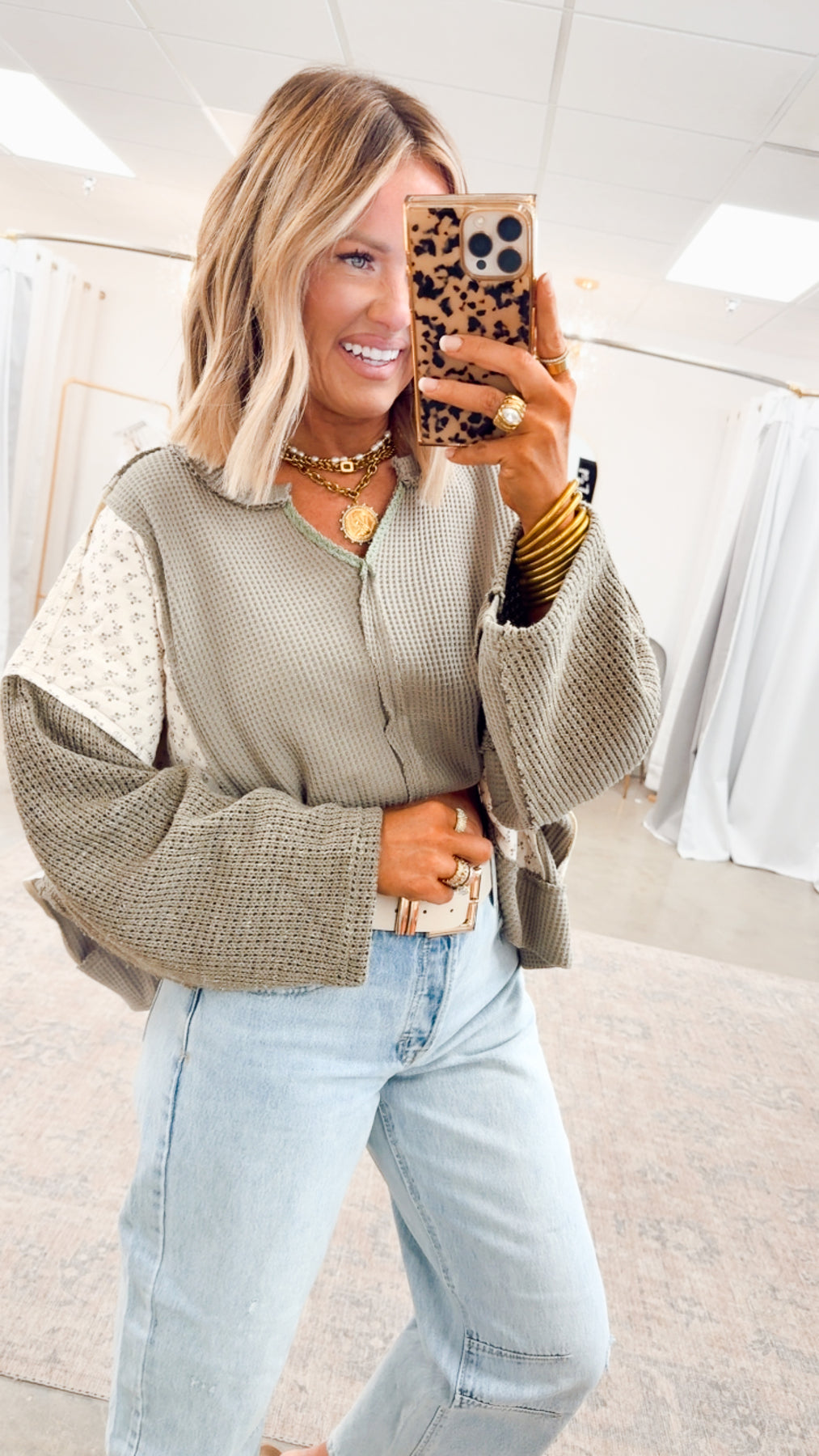 Earthy tones meet laid-back elegance in the Moonlit Moss Top. Designed with a flattering V-neckline and straight sleeves, this cropped silhouette blends cozy thermal texture with quilted knit accents. Raw edge details and a subtle floral pattern add a touch of effortless charm, making it the perfect top for relaxed days that still call for style.
