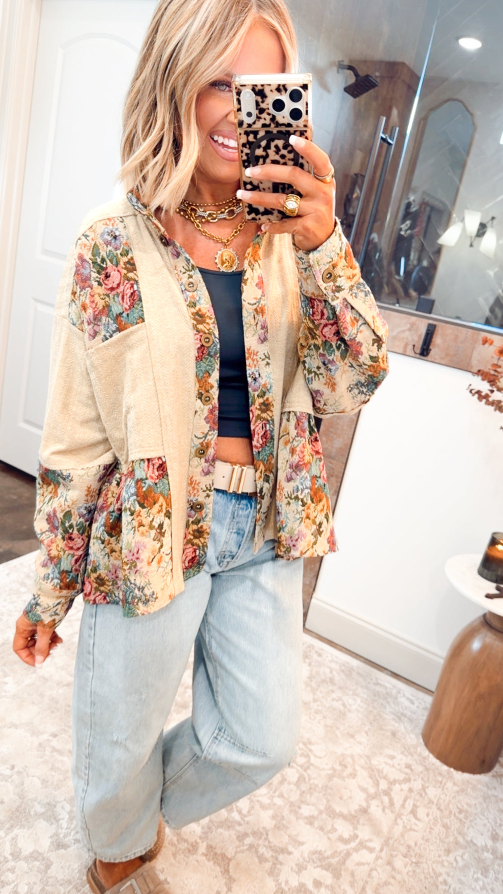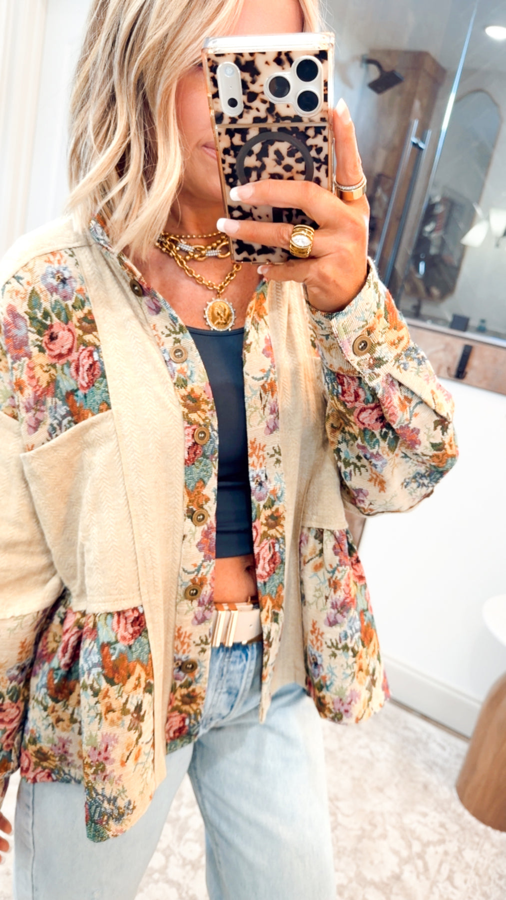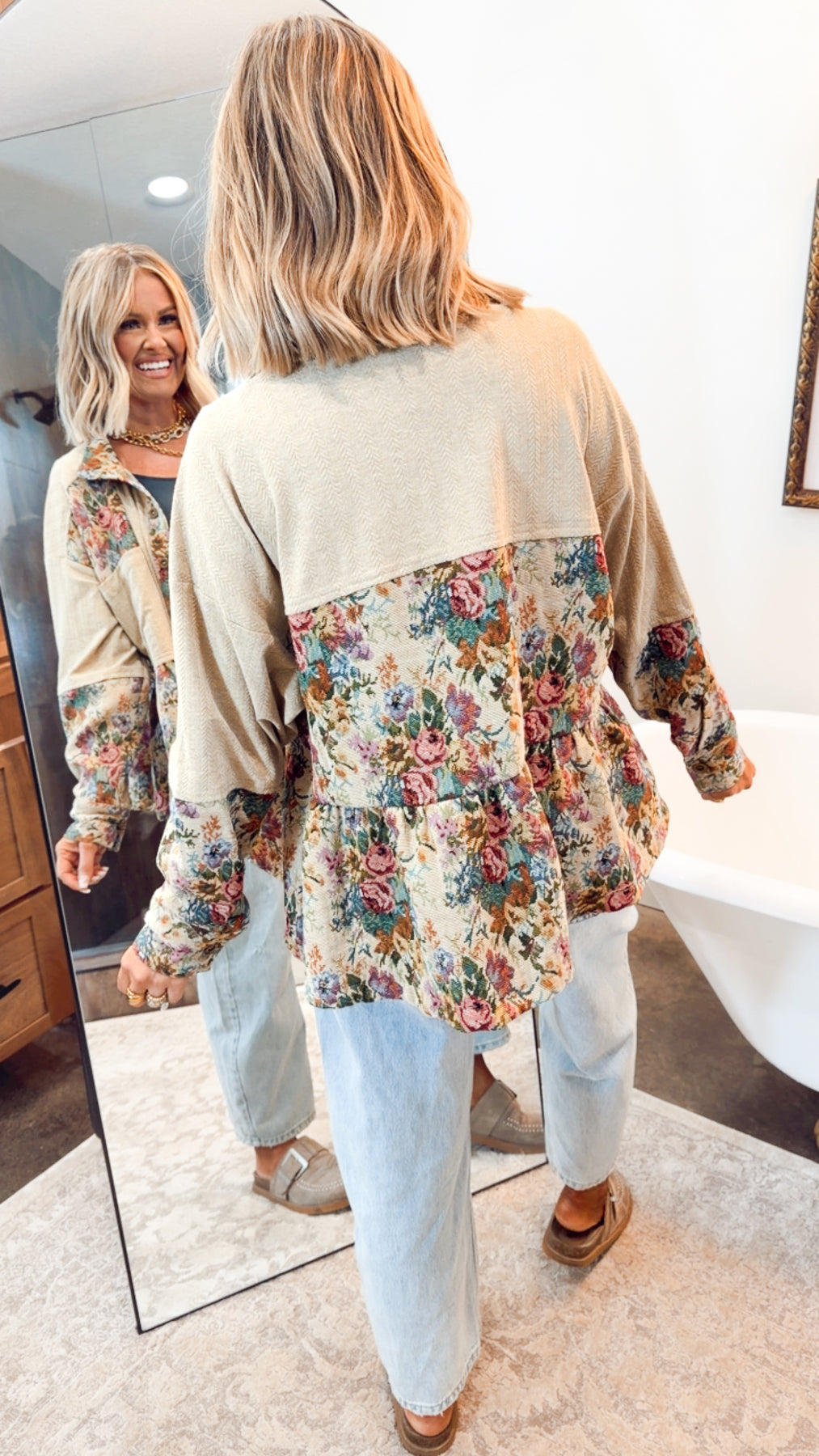The Poppy Peplum Top is a charming blend of vintage romance and modern boutique style. Crafted with a mix of floral patchwork panels and solid contrast accents, this button-down effortlessly stands out as a soft statement piece. The relaxed silhouette offers easy comfort, while the subtle peplum hem adds a touch of feminine shape and movement—perfect for elevating everyday looks with refined detail.