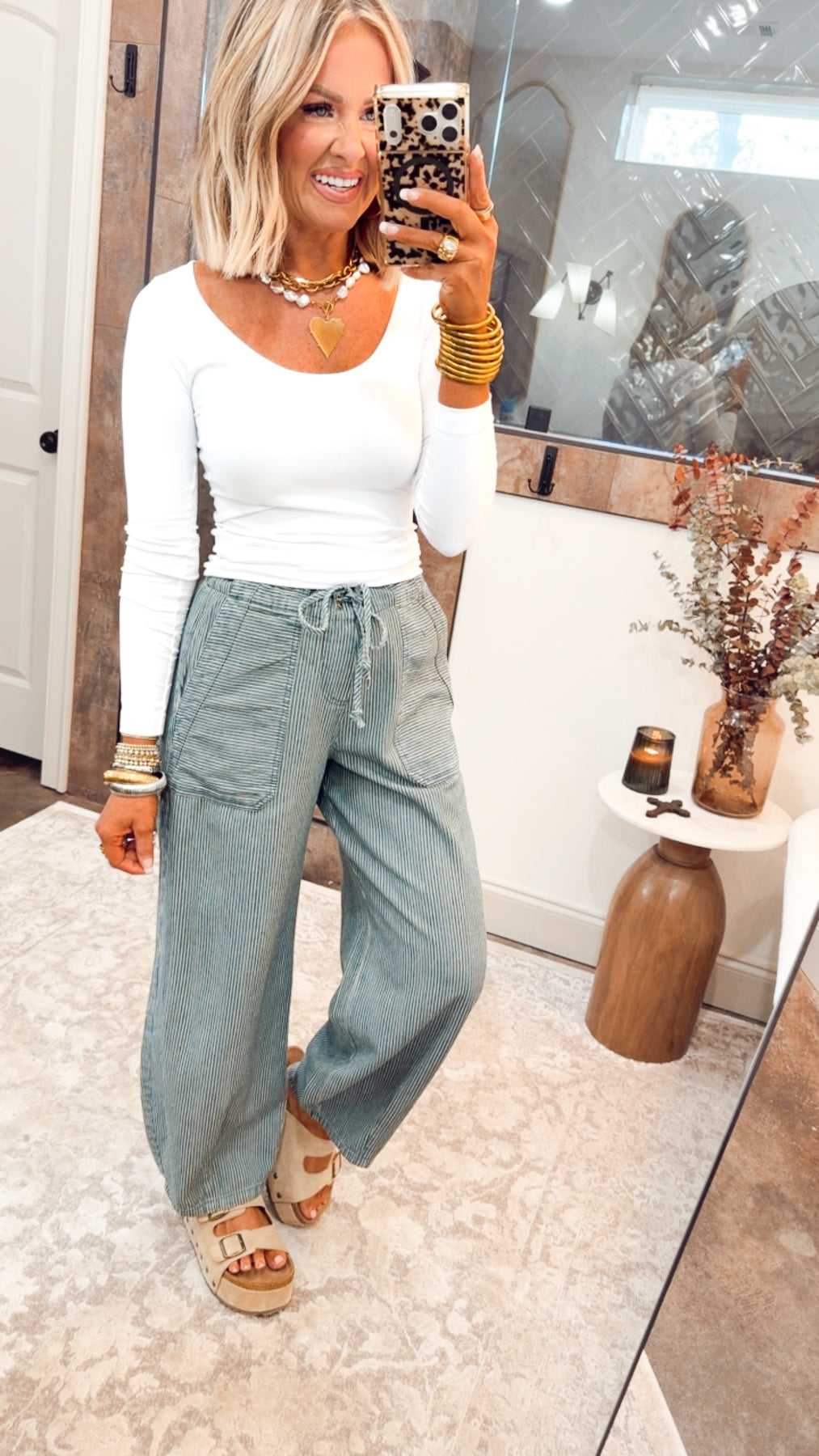 The drawstring waist tie allows for a customizable, comfortable fit, while functional pockets keep things practical and wearable. Featuring a wide leg that tapers slightly at the ankle, this style creates a flattering shape with modern, on-trend appeal. Finished in a stripe denim pattern, these pants feel fresh, playful, and easy to style with fitted tanks, cropped knits, or lightweight layers.