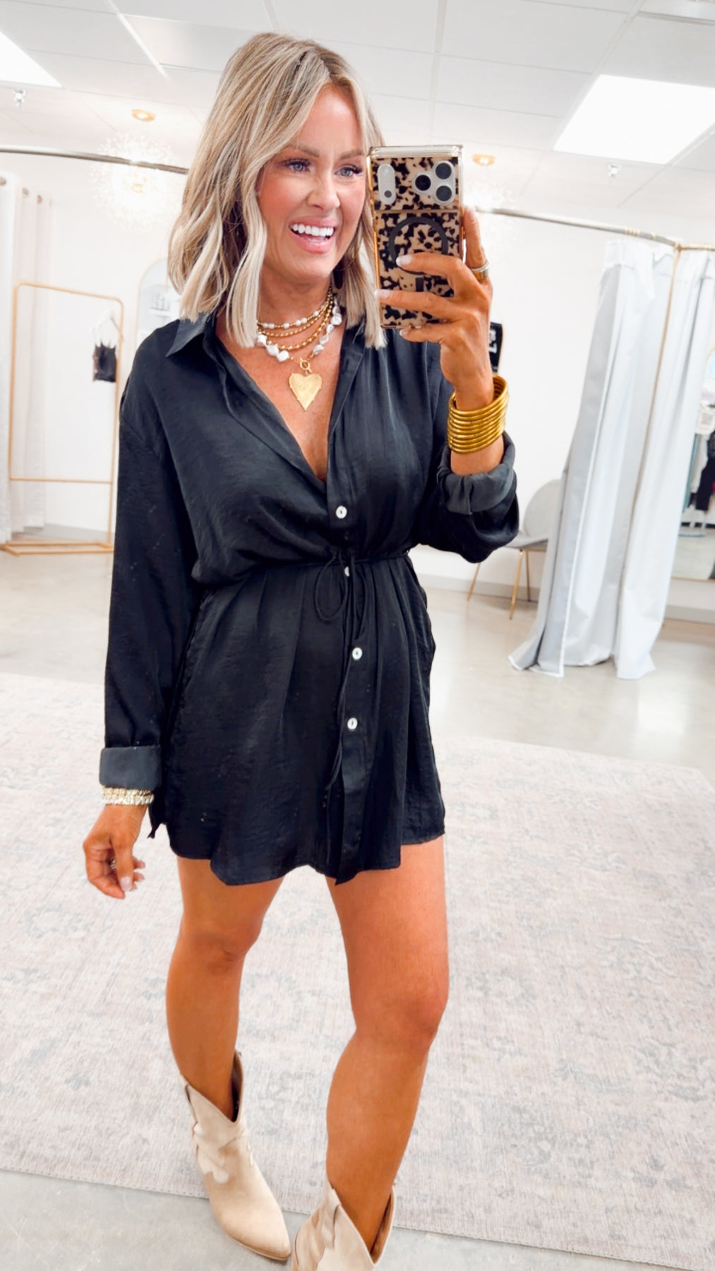 Curved shirttail hem that enhances the dress-inspired silhouette
