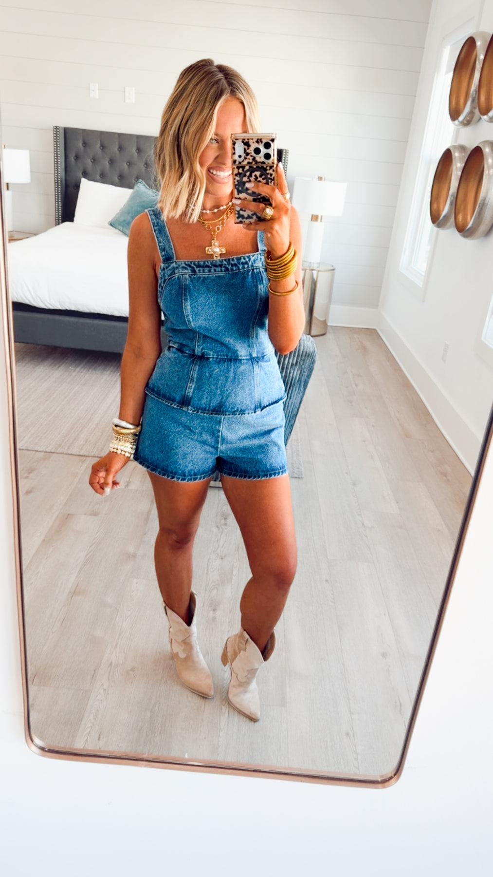 Sweet with a little sass, the Southern Belle Peplum Romper brings southern charm and flirty style to the spotlight. With a flattering peplum silhouette and an open back that turns heads, this denim romper is a must-have for concert nights, fairs, and every weekend adventure.