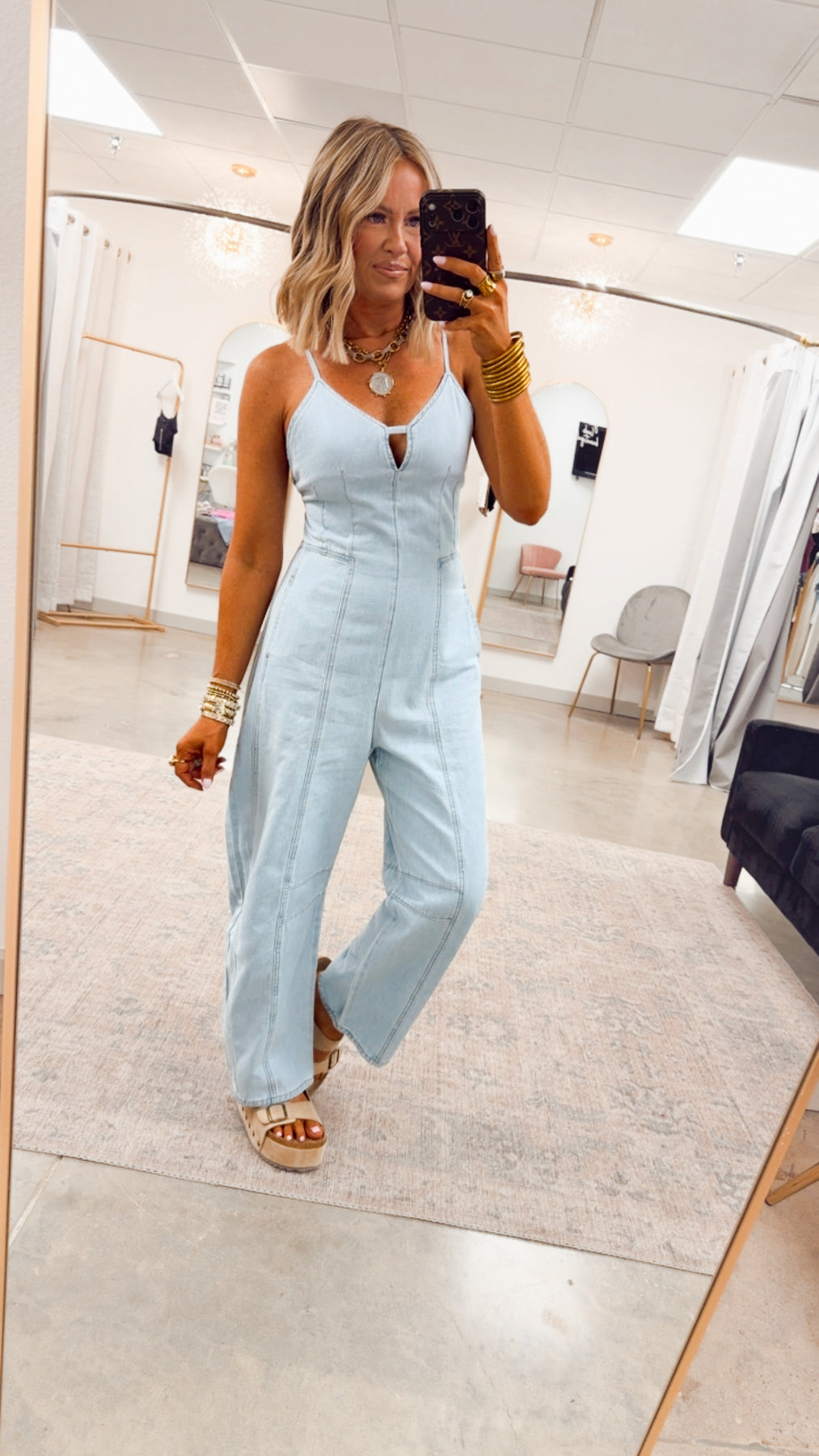 The open back with cross-strap tie detailing adds a feminine twist to its utility-inspired design, while the soft denim fabrication keeps it comfortable for all-day wear. Whether you're pairing it with boots for a western vibe or dressing it up with heels and accessories, this piece does all the work for you—easy, elevated, and undeniably cool.