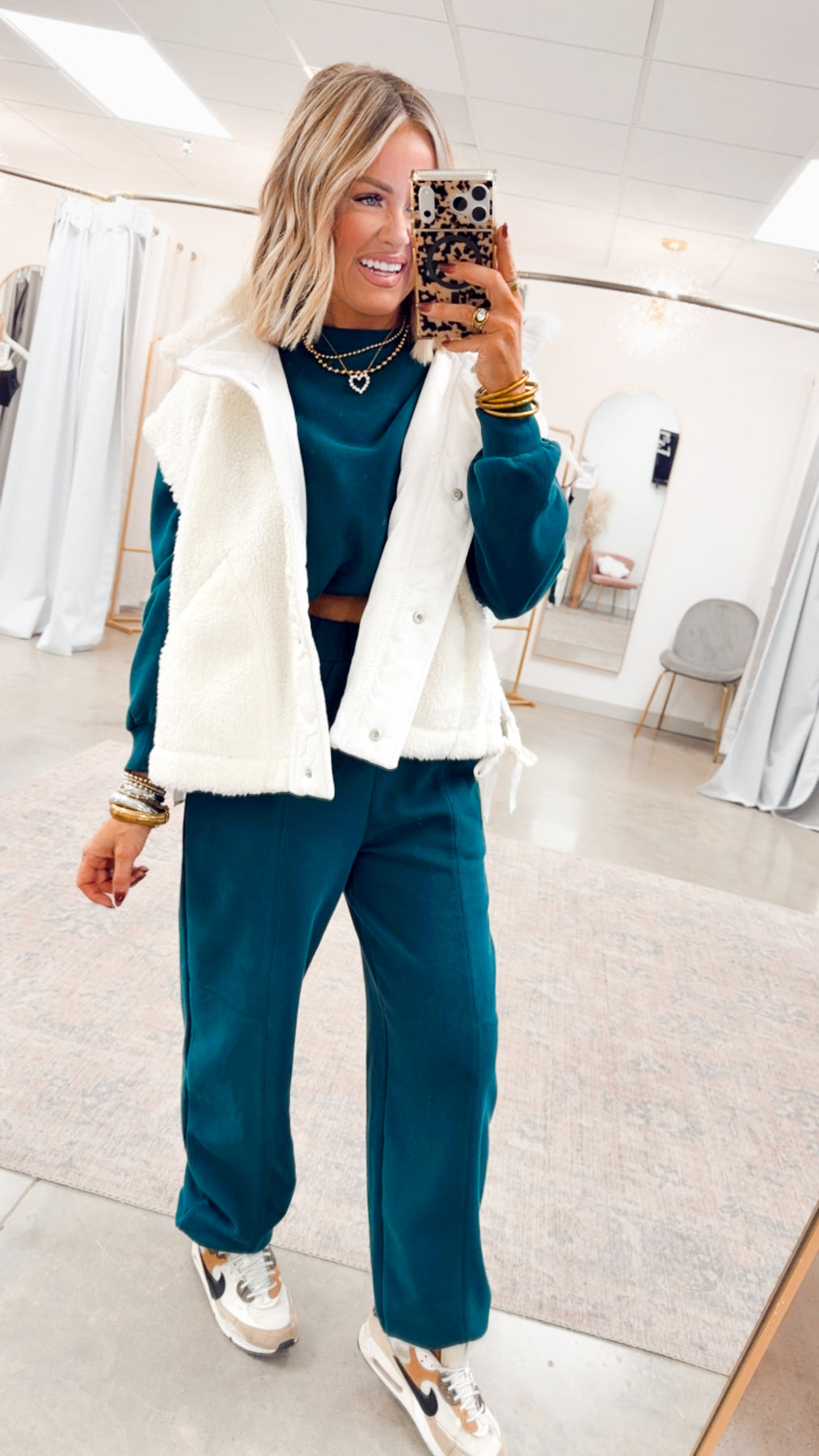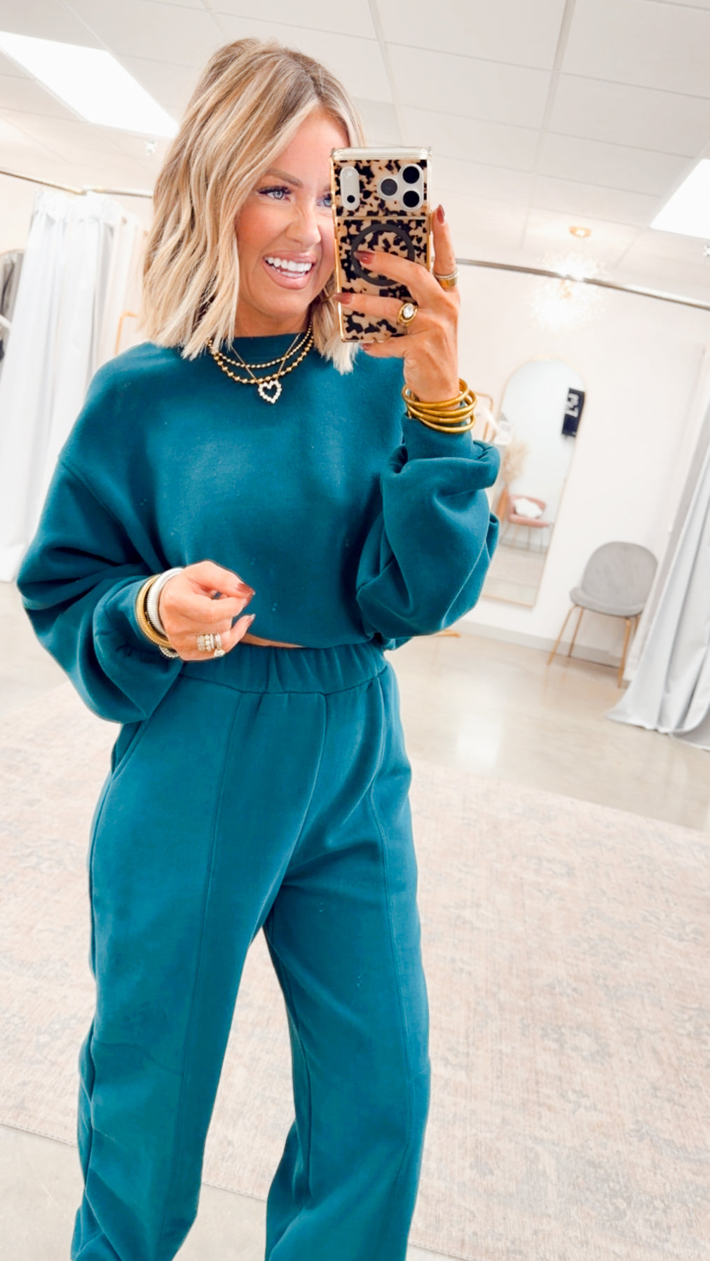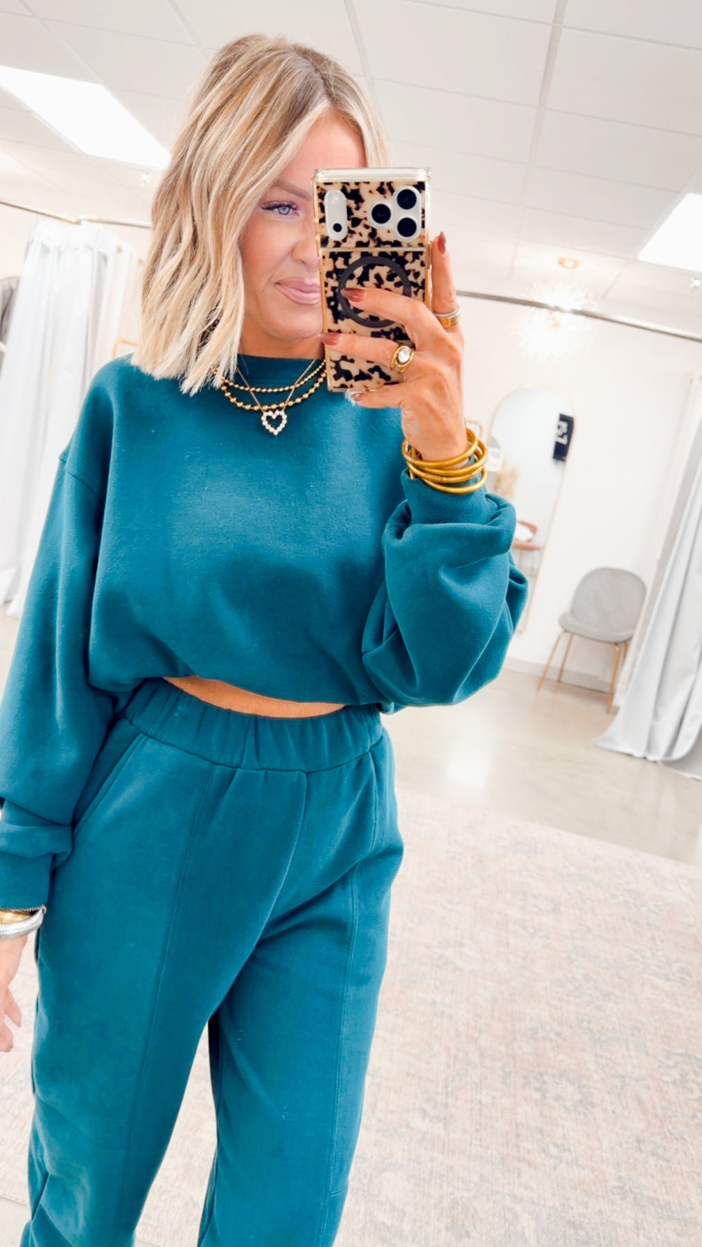 The cropped sweatshirt features a relaxed fit with an elastic hem that gently cinches at the waist, creating a flattering shape while keeping things comfy. Paired with fashion-forward jogger pants designed with distinct seam detailing, this set delivers a sculpted, modern feel without sacrificing comfort. Whether you’re running errands, traveling, or enjoying a cozy day in, Lounge Ease keeps you looking effortlessly styled.