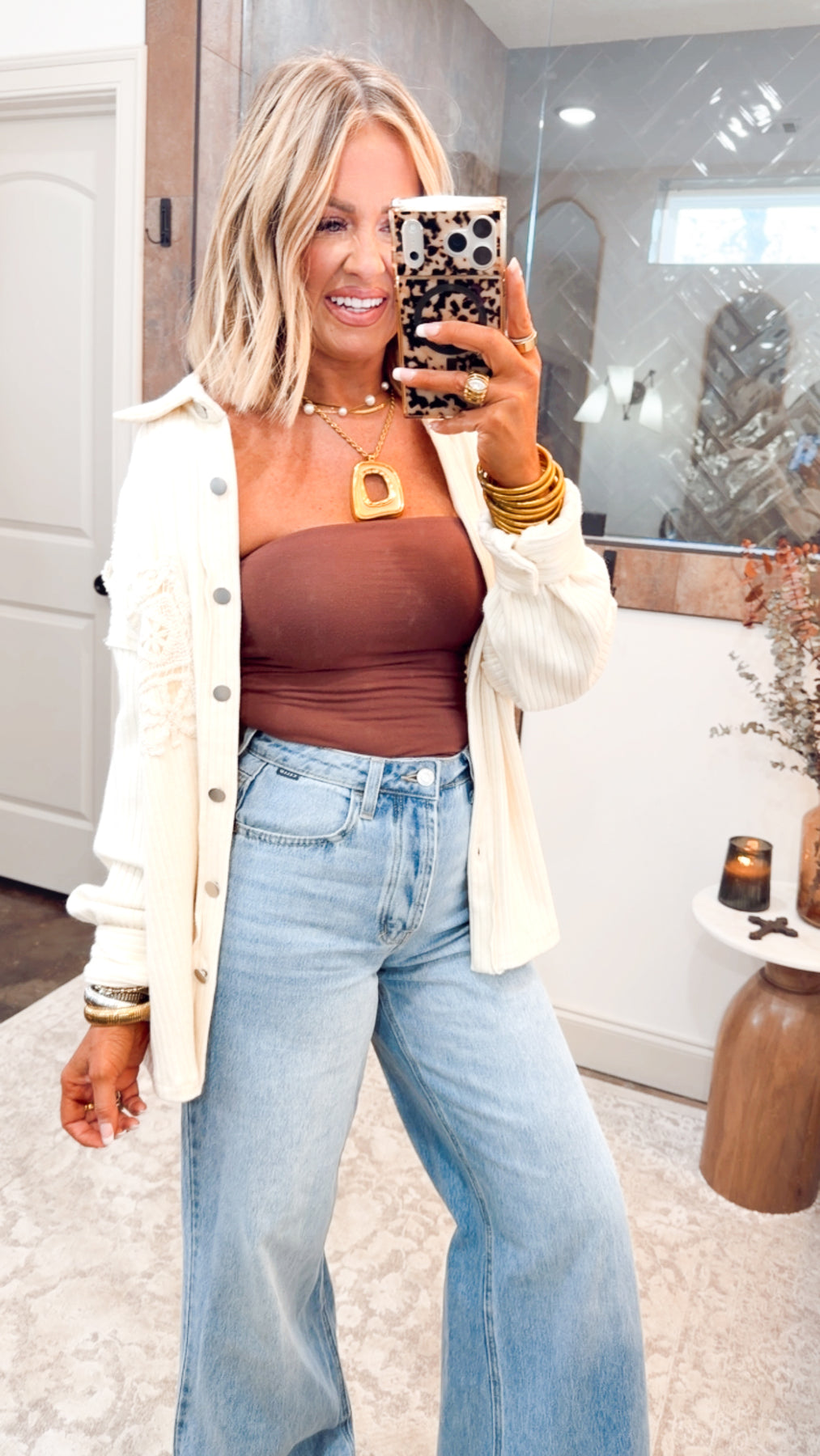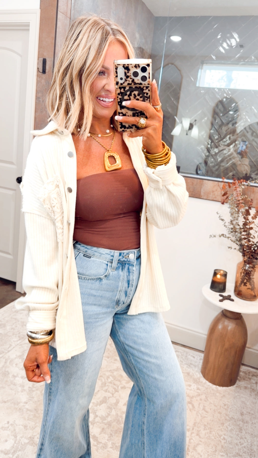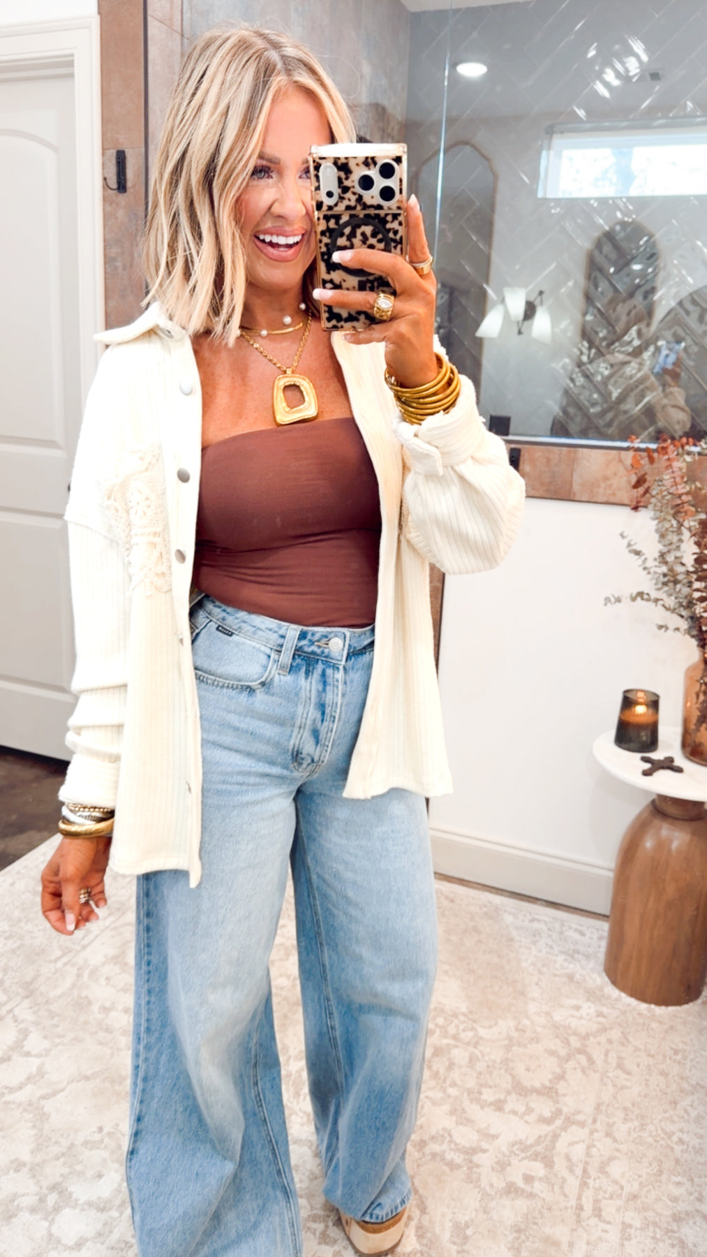 Elevate your layering game with the Cambria Corduroy Shaket — a dreamy fusion of soft corduroy and delicate crochet lace. With its relaxed fit and intricate detailing, this piece brings elegance to a casual silhouette. Dress it up or wear it open over your basics for a touch of feminine charm.