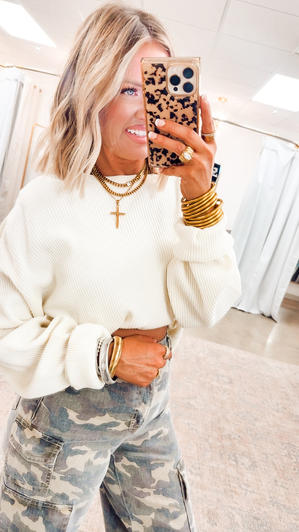 Cozy meets chic in our Cream Waffle Bliss Cropped Sweater. Designed with a soft waffle knit texture and a slightly cropped fit, this sweater is perfect for pairing with your favorite high-waisted jeans or skirts. The creamy neutral hue makes it easy to dress up or keep casual, while the relaxed silhouette gives effortless comfort you’ll reach for all season long.