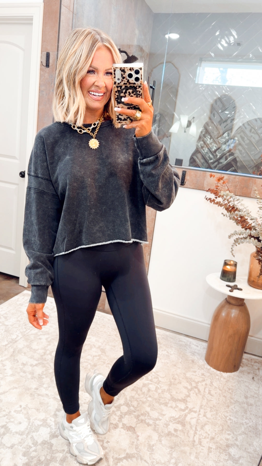 Crafted in a soft denim wash fabric, each piece has a lived-in look that feels worn-in and unique. Whether you’re heading to a workout, running errands, or lounging in comfort, this sweatshirt blends athleisure ease with boutique-level style.