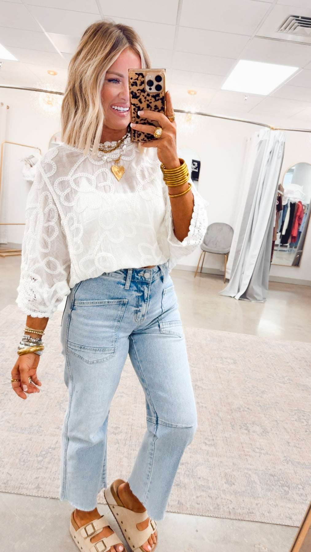 Delicate and dreamy, the Soft Whispers Blouse is the perfect blend of feminine charm and cozy texture. With its round neckline, crochet knit construction, and intricate floral embroidery, this piece is a true statement maker while remaining effortlessly wearable. Designed as a one-size-fits-all silhouette, it drapes beautifully on every body, making it an easy go-to for your wardrobe.