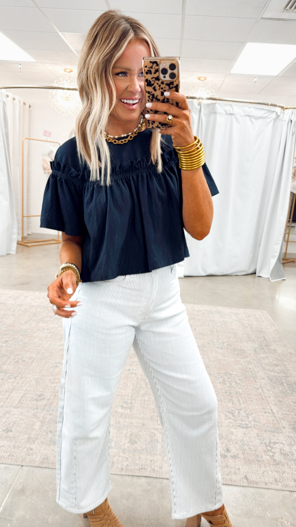 The Camryn Cropped Blouse is a chic and versatile piece that blends femininity with effortless style. With its shirred detailing and cropped silhouette, this blouse is perfect for pairing with your favorite light denim for an easy, polished look.