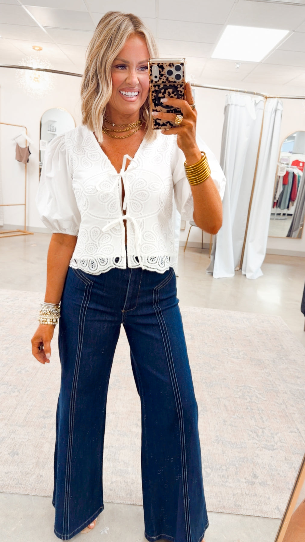 Romantic, airy, and effortlessly sweet — the Estelle Eyelet Blouse is a feminine staple with timeless charm. Crafted from soft embroidered cotton, this blouse features delicate eyelet detailing, voluminous puff sleeves, and playful front tie accents. It's the perfect top for adding a touch of elegance to your everyday look.