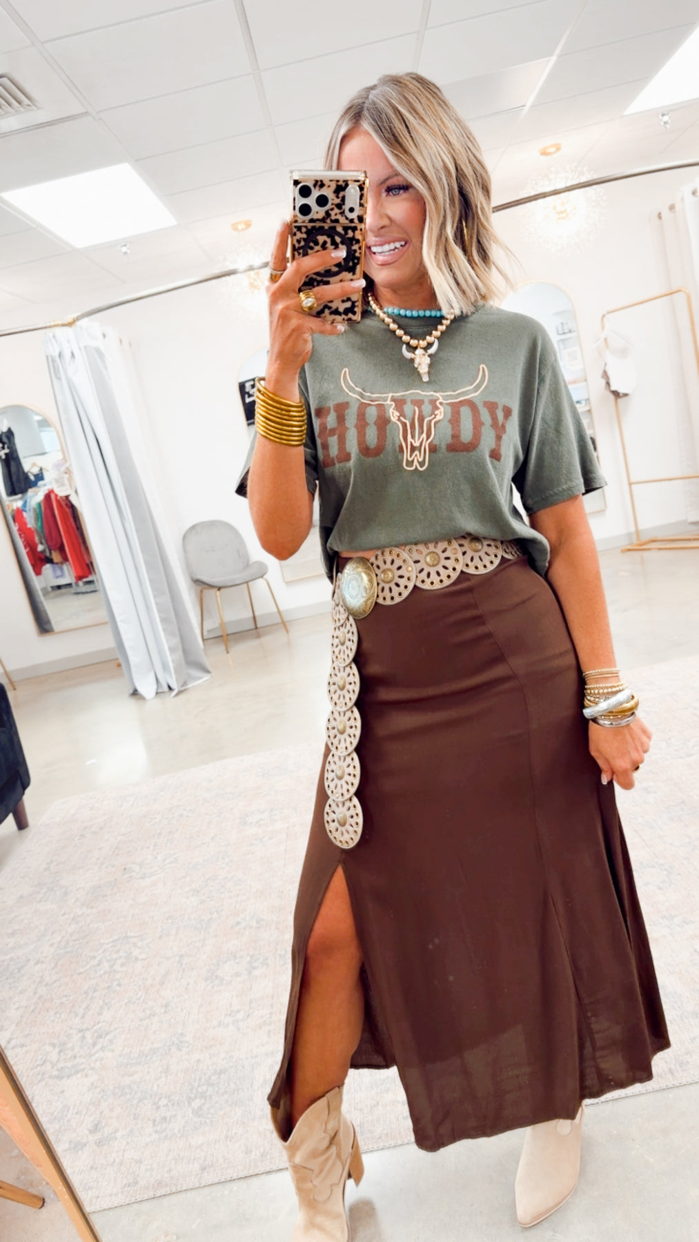 With its relaxed, easy-to-wear fit and lightweight feel, the Howdy Tee is perfect for pairing with denim, cutoffs, or layering under jackets and shackets. Whether you’re heading to a rodeo, country concert, game day, or just keeping things casual, this tee brings that laid-back western vibe you’ll reach for again and again.
