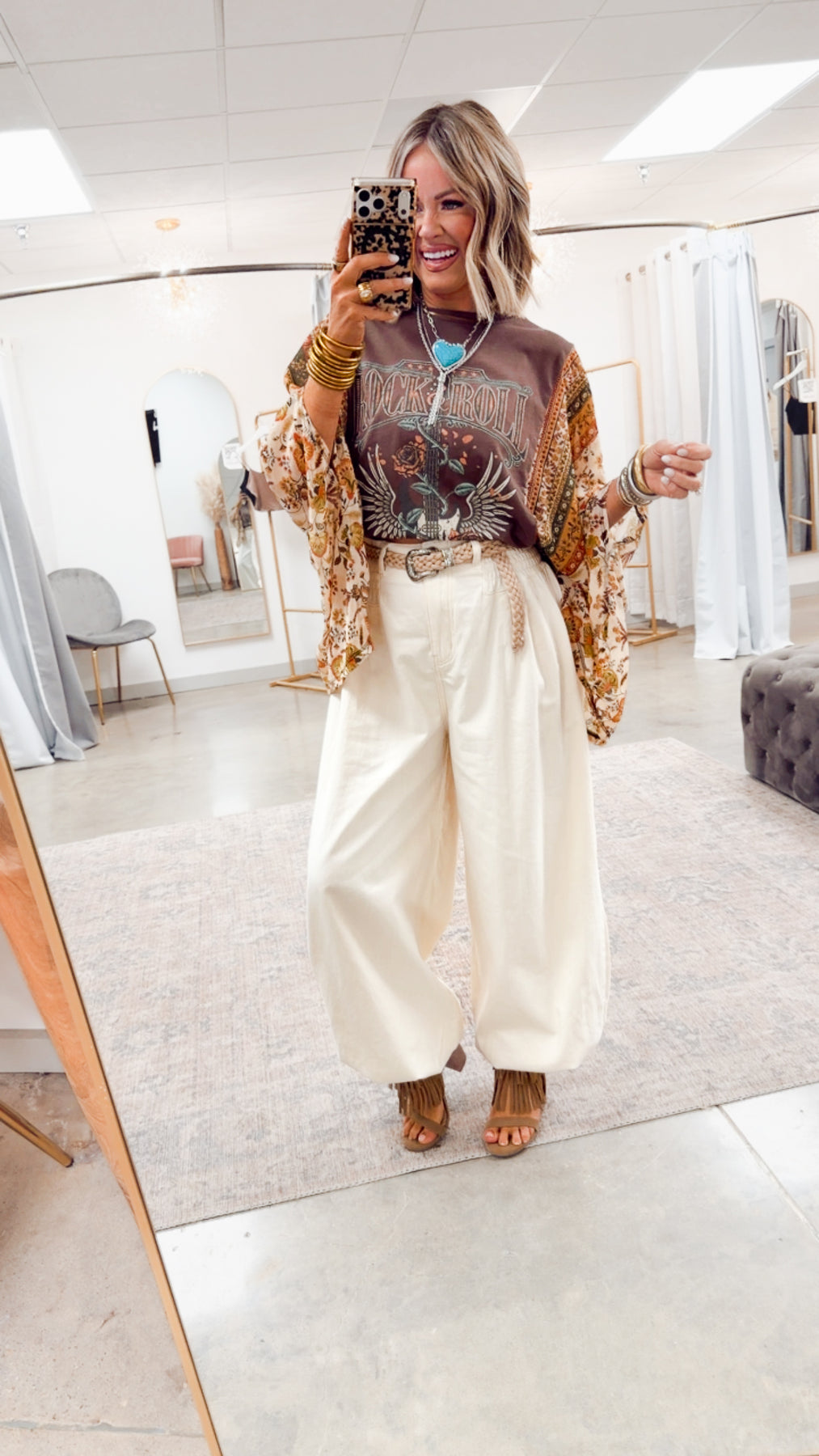 Bold and effortlessly cool, the Rock N Roll Graphic Kantha Top fuses vintage rock ‘n’ roll attitude with handcrafted, bohemian flair. Made from lightweight, breathable fabric, this rustic Kantha-style top features a statement graphic paired with flowy contrast sleeves for an easy, laid-back silhouette. It’s the perfect piece for adding edge to your everyday wardrobe while still feeling soft and wearable.