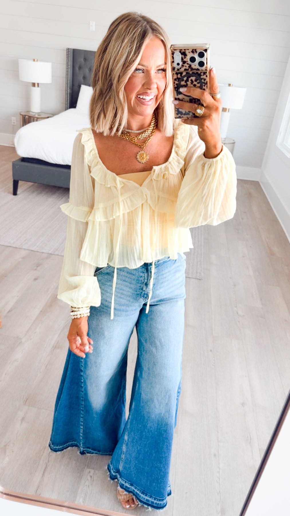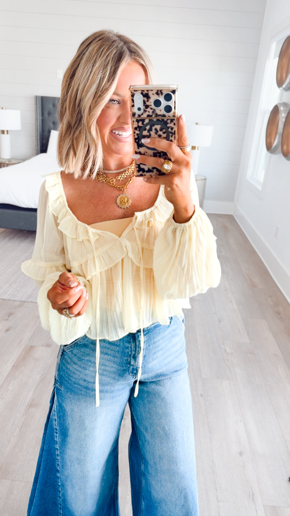 Light, airy, and effortlessly feminine, The Daisy Drift Blouse is the perfect piece to bring soft, romantic charm to your everyday wardrobe. Designed with a flattering scoop neckline and delicate ruffle detailing, this sheer blouse creates beautiful movement while keeping your look light and polished.