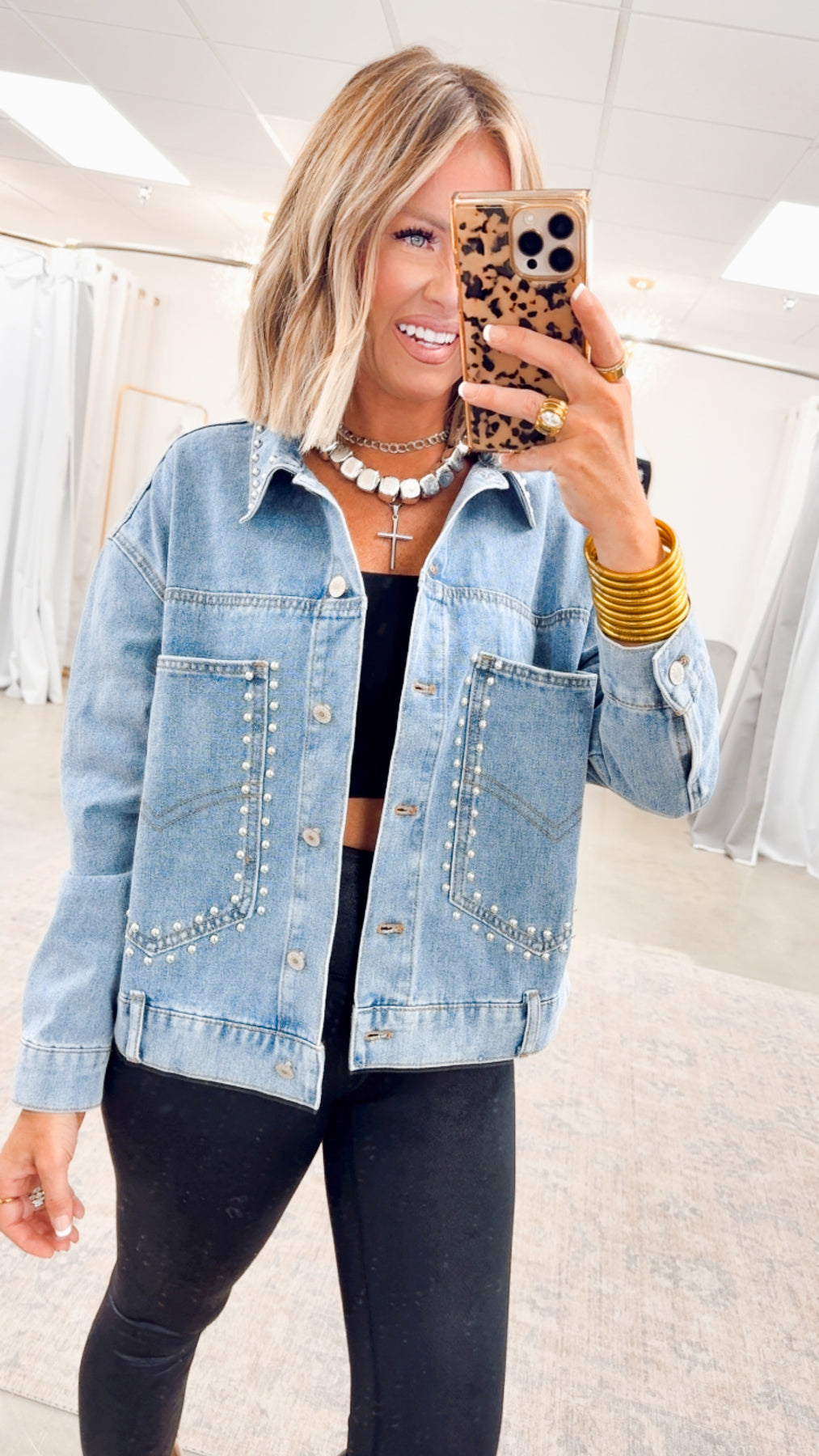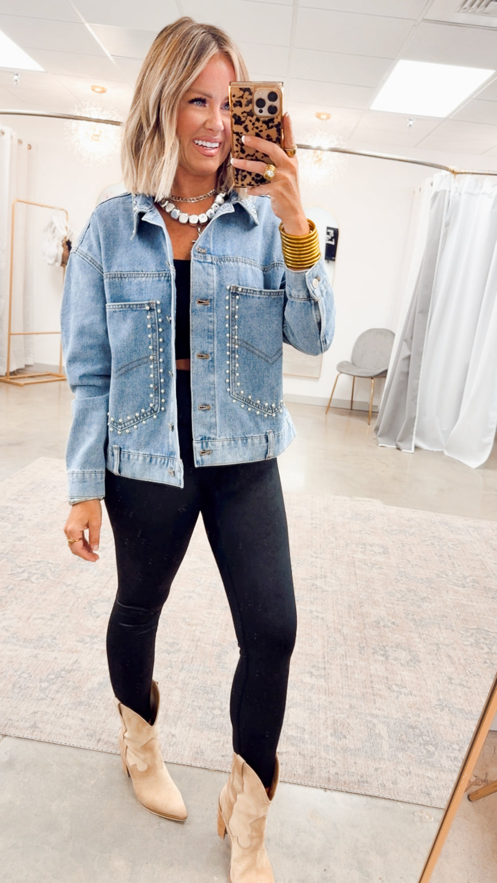 Elevate your outerwear lineup with this Westward Studded Detail Denim Jacket featuring precision-placed studded detailing at the collar and pockets. Designed to stand out yet remain versatile, it’s the perfect blend of laid-back denim and boutique polish. Whether layered over cozy knits, styled with matching sets, or thrown over a flowy dress, this piece is your year-round go-to for casual chic with a touch of edge.