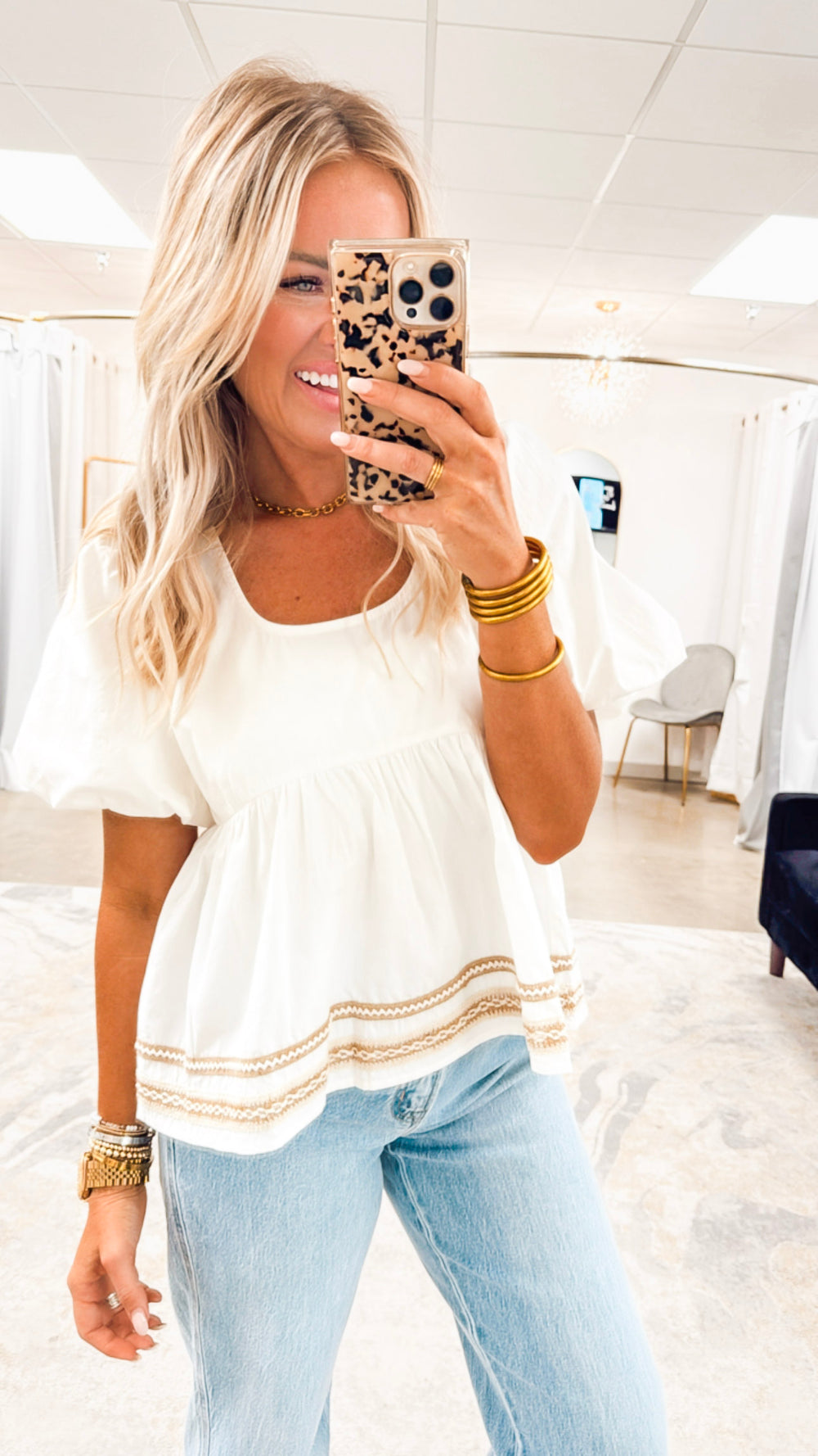 Sweet, feminine, and full of charm — the Arabella Babydoll Top is the effortless statement piece your wardrobe needs. With delicate embroidered trim and puff sleeves, this top brings a romantic touch to any look.