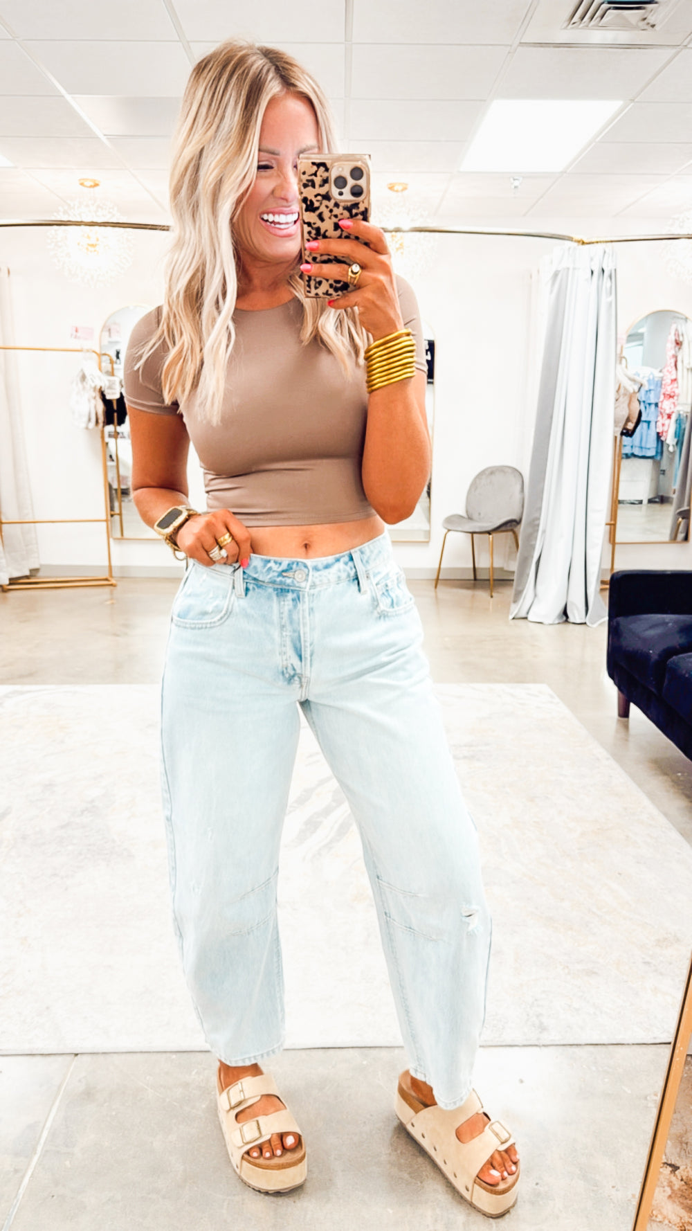 Round Neck Short Sleeve Crop Top - Deep Taupe