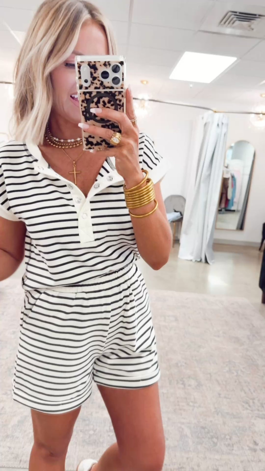 Meet the Emerson Stripe Shorts Set, your new favorite casual-cute outfit for everyday lounging, weekend errands, or warm-weather adventures. This two-piece knit set blends soft comfort with playful contrast details, giving you an easy matching look that still feels elevated. The striped pattern adds a timeless touch, while the relaxed fit makes it so easy to wear. Whether you're styling them together or pairing each piece separately, this set is the perfect mix of cozy and effortlessly chic.