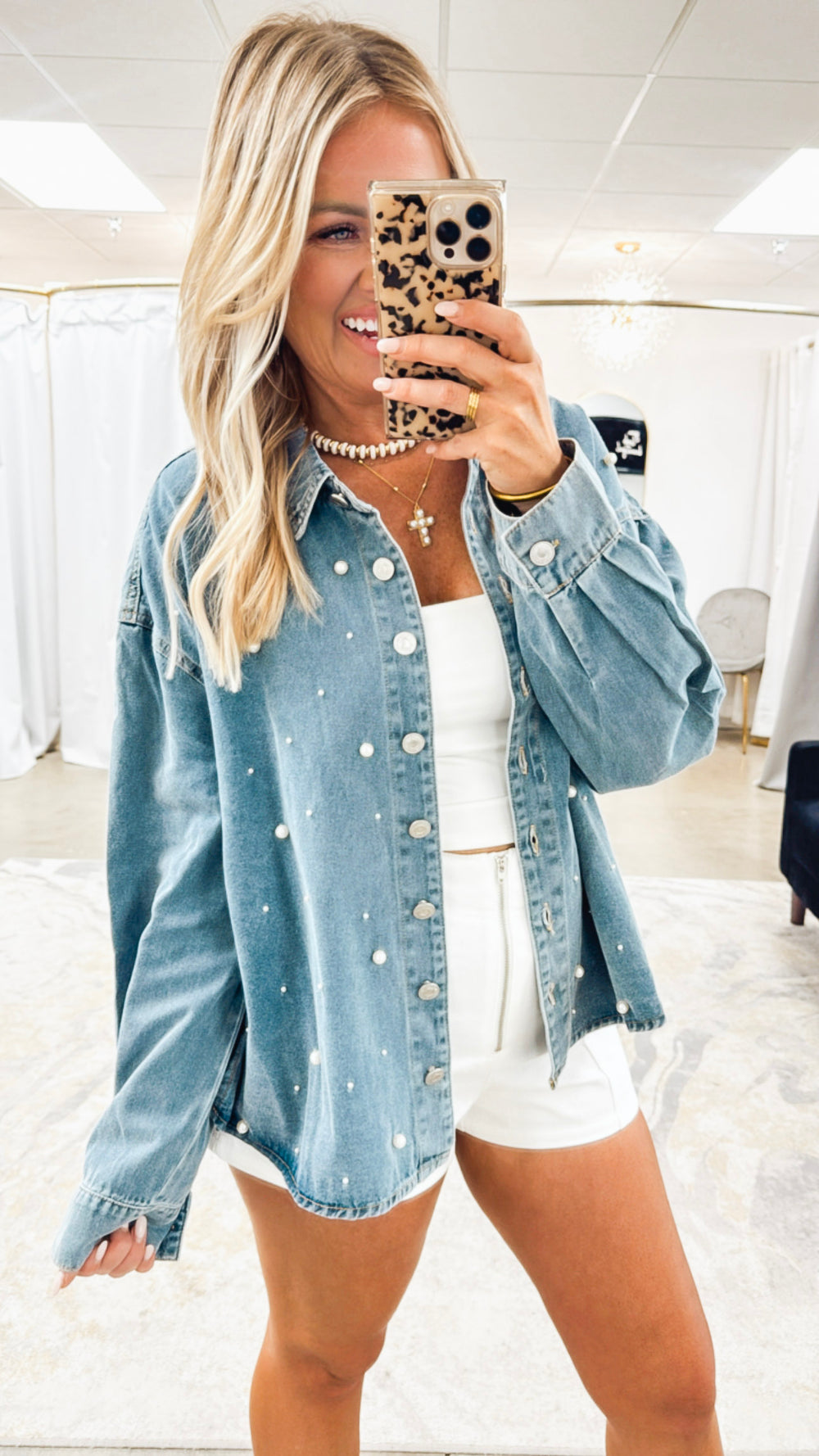 Make a statement with the Pearl Oversized Denim Shirt—your go-to piece for a fashionable, everyday look!