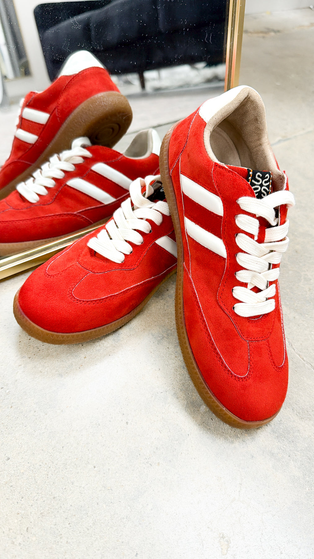 Say hello to your new favorite statement sneaker — the Renee Sneaker in rich red suede. Designed to turn heads while keeping comfort in check, this bold yet timeless style pairs a sleek, low-top silhouette with a plush suede finish for that perfect balance of sporty and chic. The crisp white sole and coordinating laces add a touch of contrast, making these sneakers easy to style with denim, dresses, or your favorite athleisure looks.