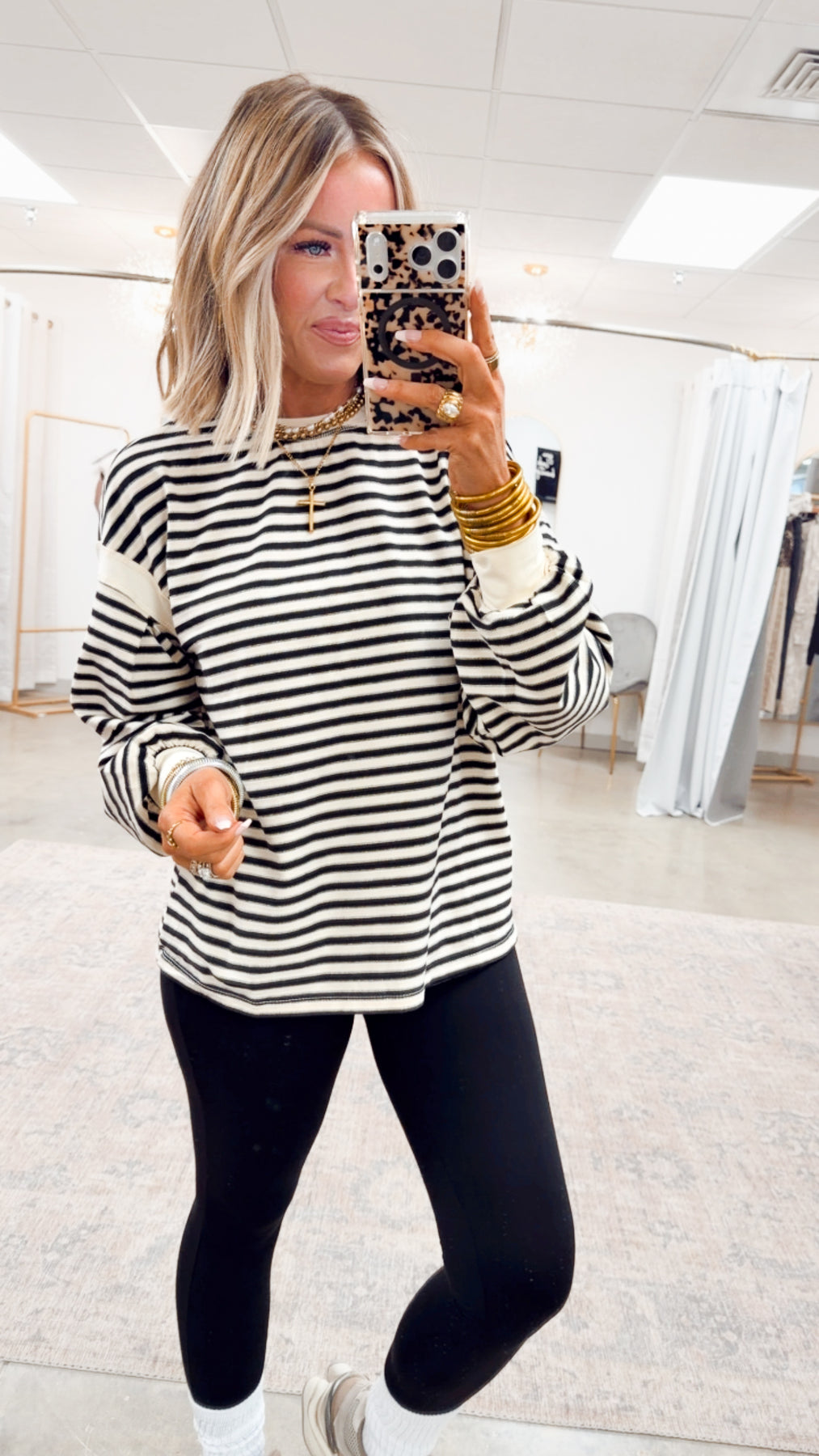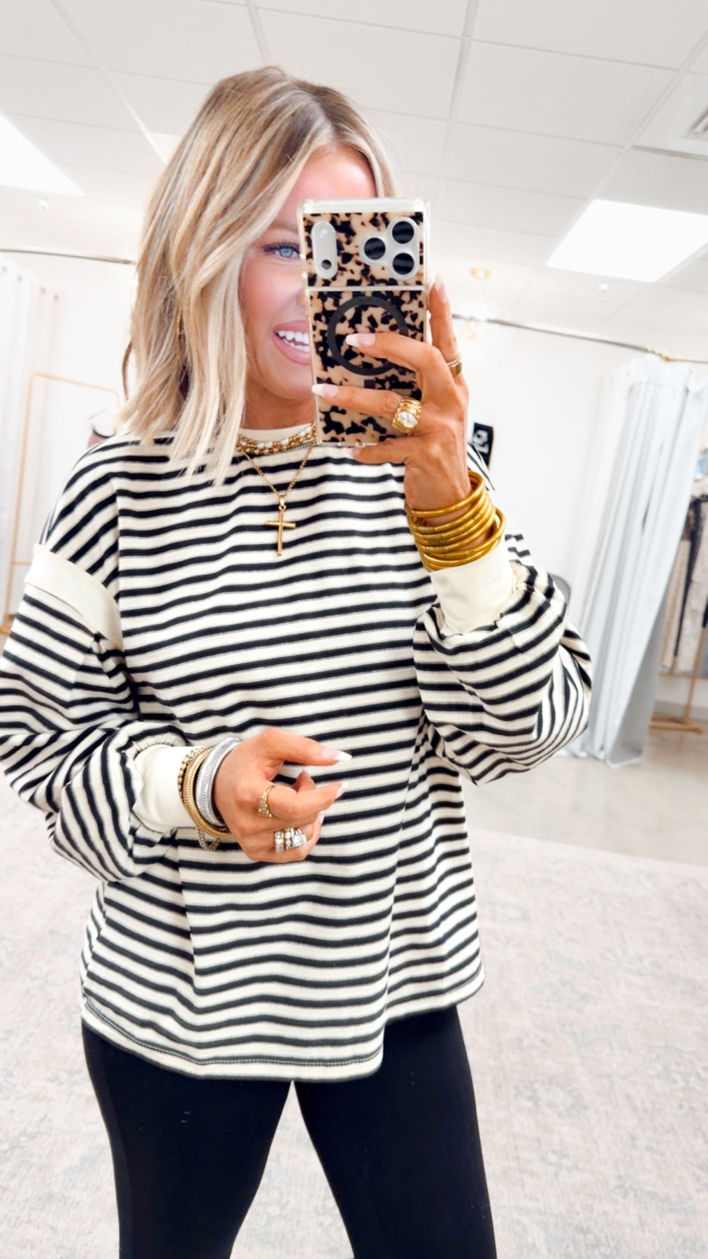 Timeless and easy to wear, the Rowan Stripe Top is a closet staple you’ll reach for again and again. Designed with a classic striped pattern and a relaxed fit, this long-sleeve top combines comfort with effortless style. Perfect for layering or wearing on its own, it transitions seamlessly from casual weekends to polished, everyday looks. Pair it with denim, trousers, or under your favorite blazer for a versatile outfit that never goes out of style.