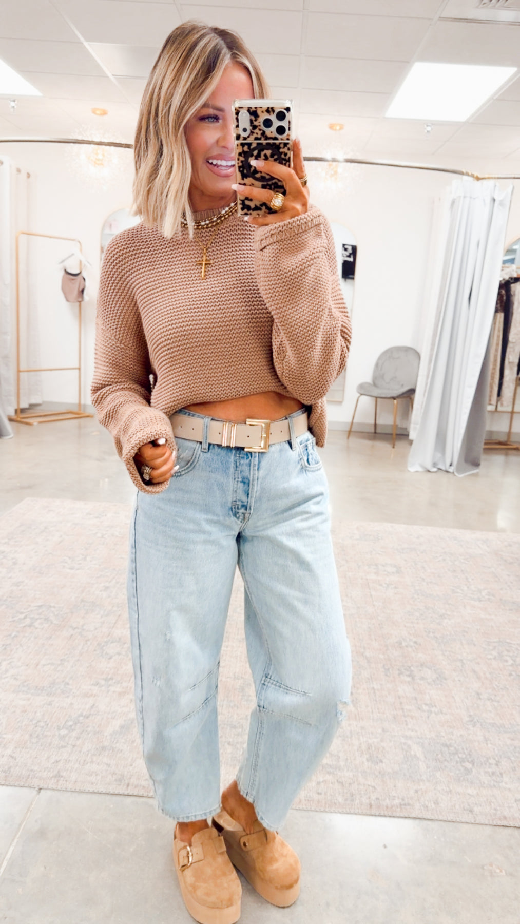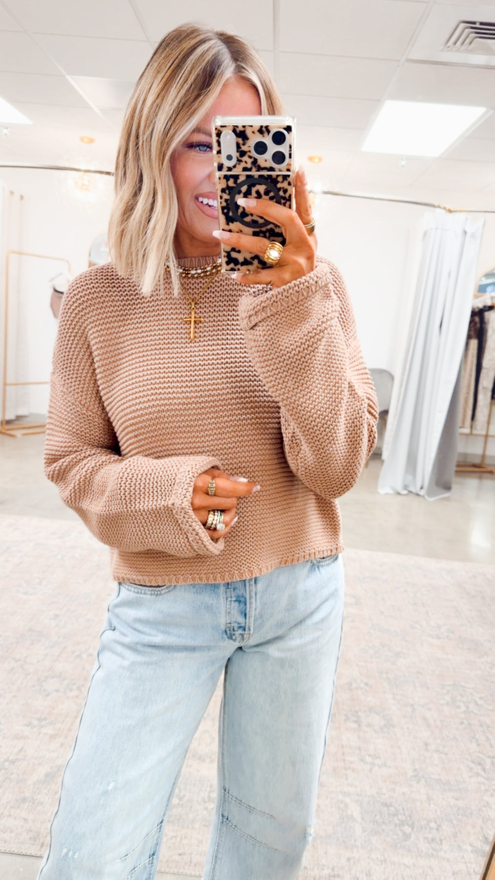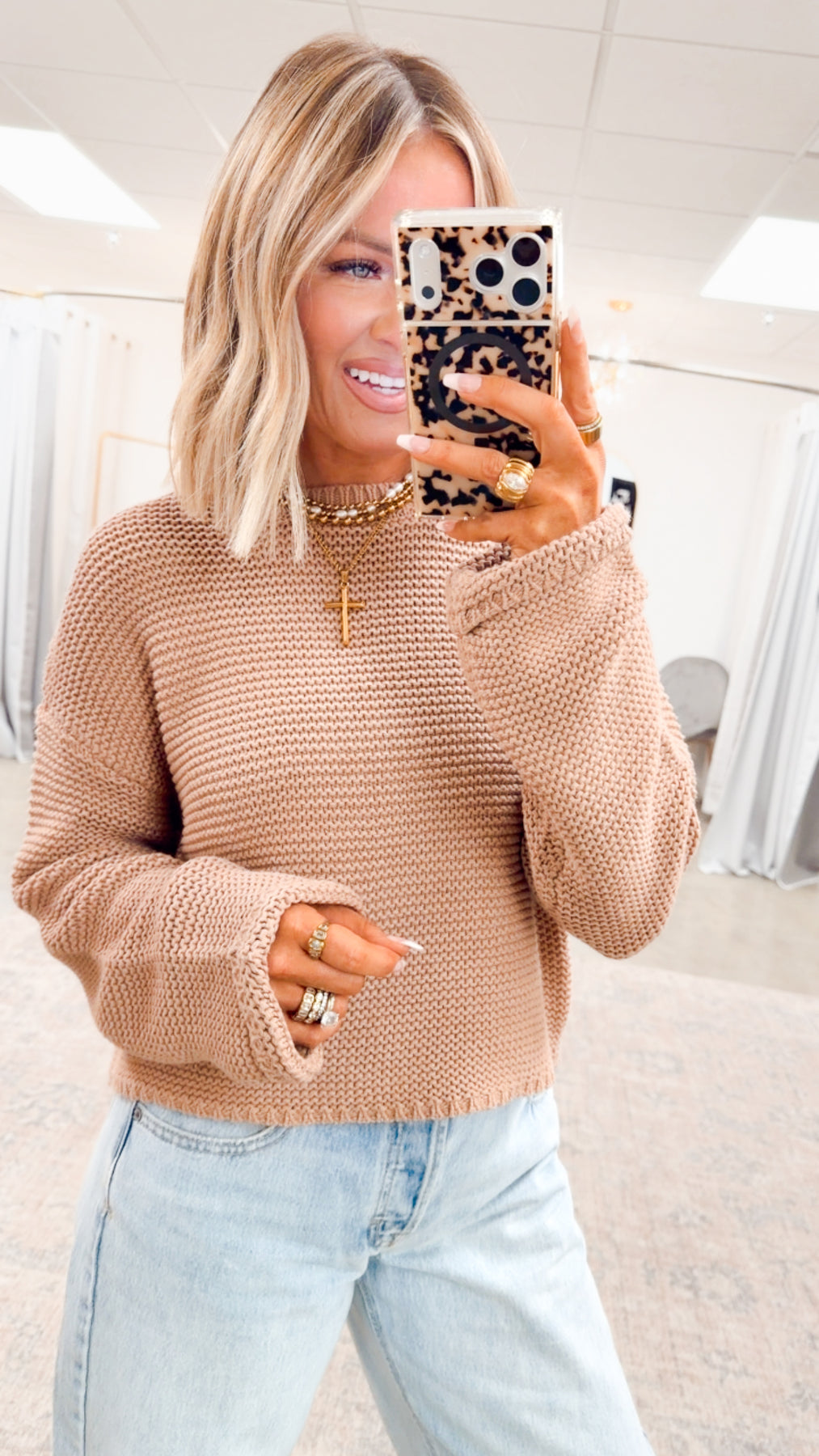 Perfect for layering or wearing solo, this sweater moves seamlessly from casual days to dressed-up moments. Pair it with denim for a cozy weekend look or style it with tailored bottoms for something more refined. Warm, versatile, and elevated — it’s the caramel classic you’ll reach for again and again.